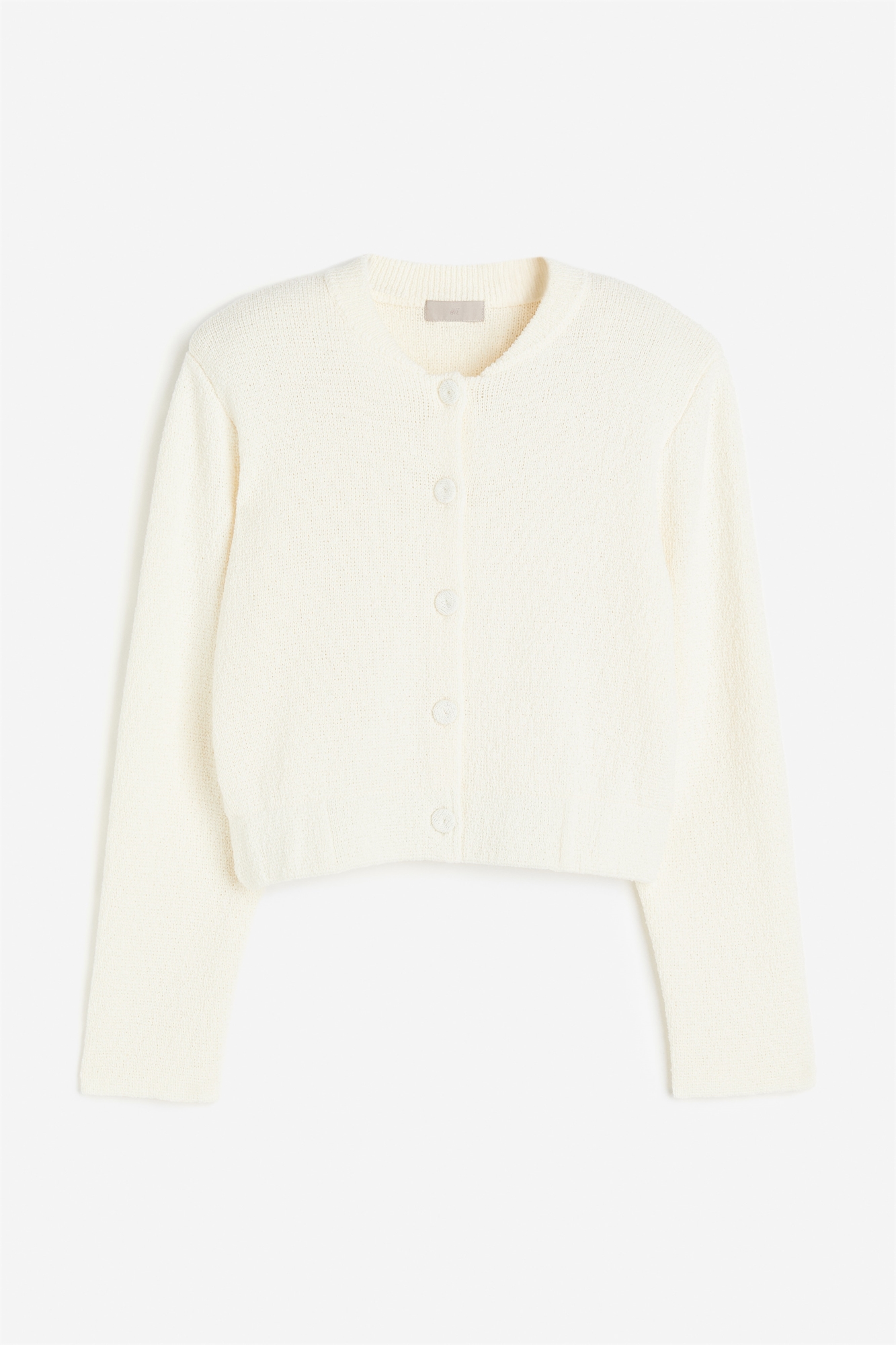 Свободный жакет из фактурного трикотажа с небольшим ребристым воротником, застежкой на пуговицы спереди, подплечниками и эластичной резинкой на подоле.