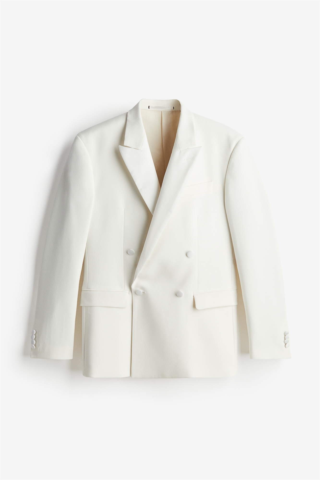 Двубортный пиджак-смокинг из тканого материала с атласными деталями. Широкие отвороты, декоративная петля для пуговиц, нагрудный карман, накладные передние карманы и три внутренних кармана. Декоративные пуговицы на манжетах и один задний клапан. На подкладке. Регулярный крой для комфортного ношения и классического силуэта.