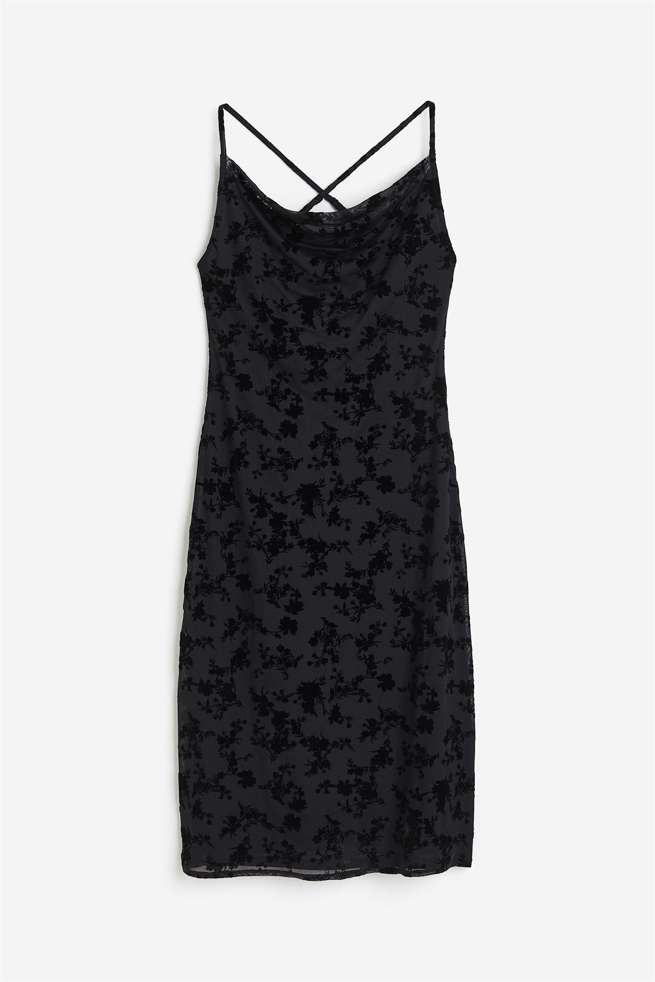 Платье длиной до колена из жаккардовой сетки с цветочным узором. Драпированный вырез спереди, низкий вырез сзади, узкие регулируемые бретели, перекрещивающиеся сзади, и прямой подол. Подкладка из джерси.