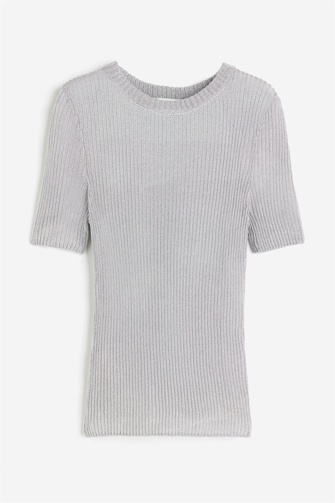 Облегающий топ из трикотажа в рубчик с переливающимися металлическими нитями. Круглый вырез, короткие рукава и прямой подол.