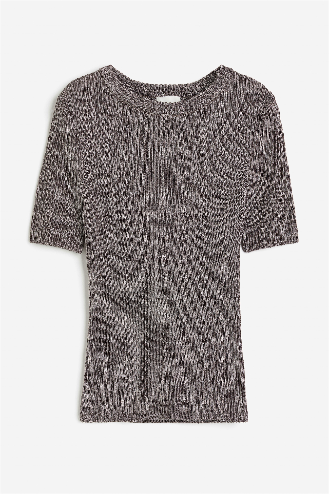 Облегающий топ из трикотажа в рубчик с переливающимися металлическими нитями. Круглый вырез, короткие рукава и прямой подол.