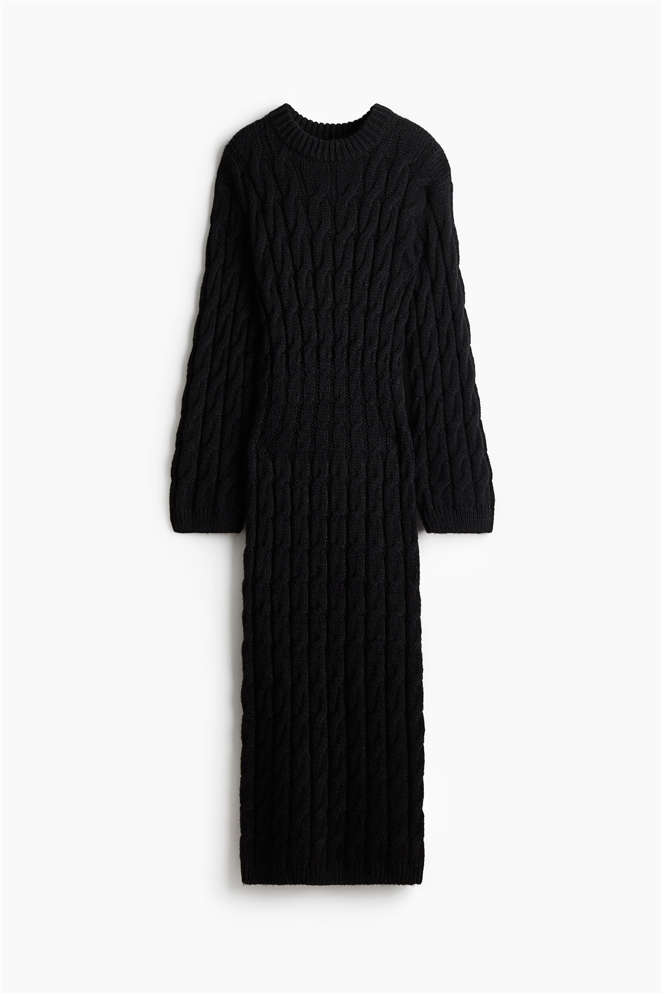 Платье длиной до колена из мягкого кабельного трикотажа с круглым вырезом, спущенными плечами и длинными рукавами. Окантовка по вырезу, манжетам и подолу.