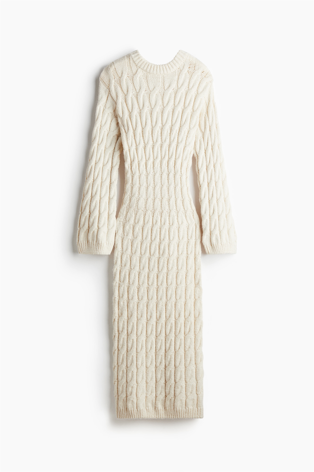 Платье длиной до колена из мягкого кабельного трикотажа с круглым вырезом, спущенными плечами и длинными рукавами. Окантовка по вырезу, манжетам и подолу.