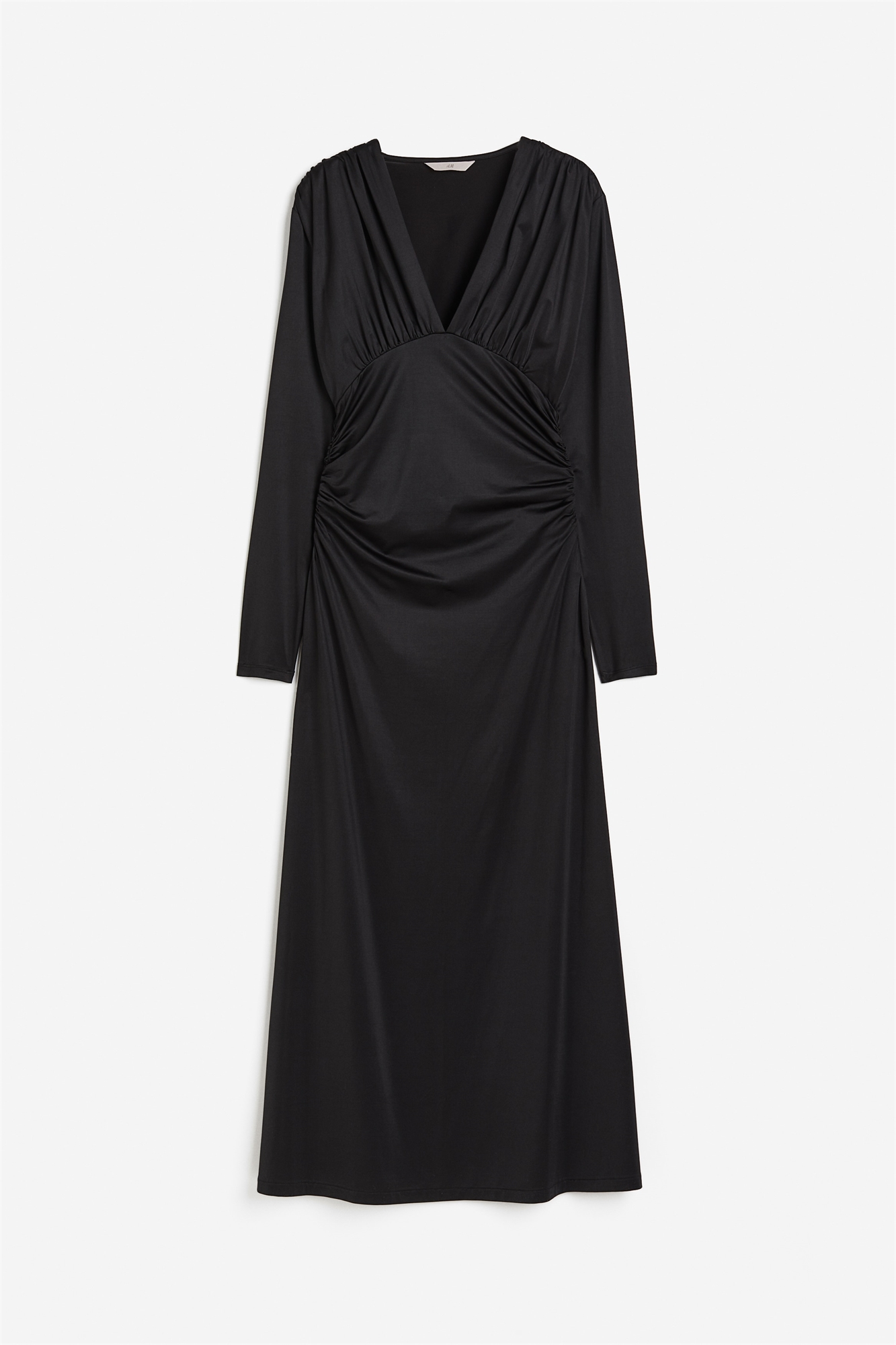 Приталенное платье длиной до щиколоток из мягкого джерси-стрейч с легким блеском. Глубокий V-образный вырез, длинные рукава и слегка расклешенная юбка. Сборчатые швы на плечах, под бюстом и по бокам талии создают эффект драпировки.