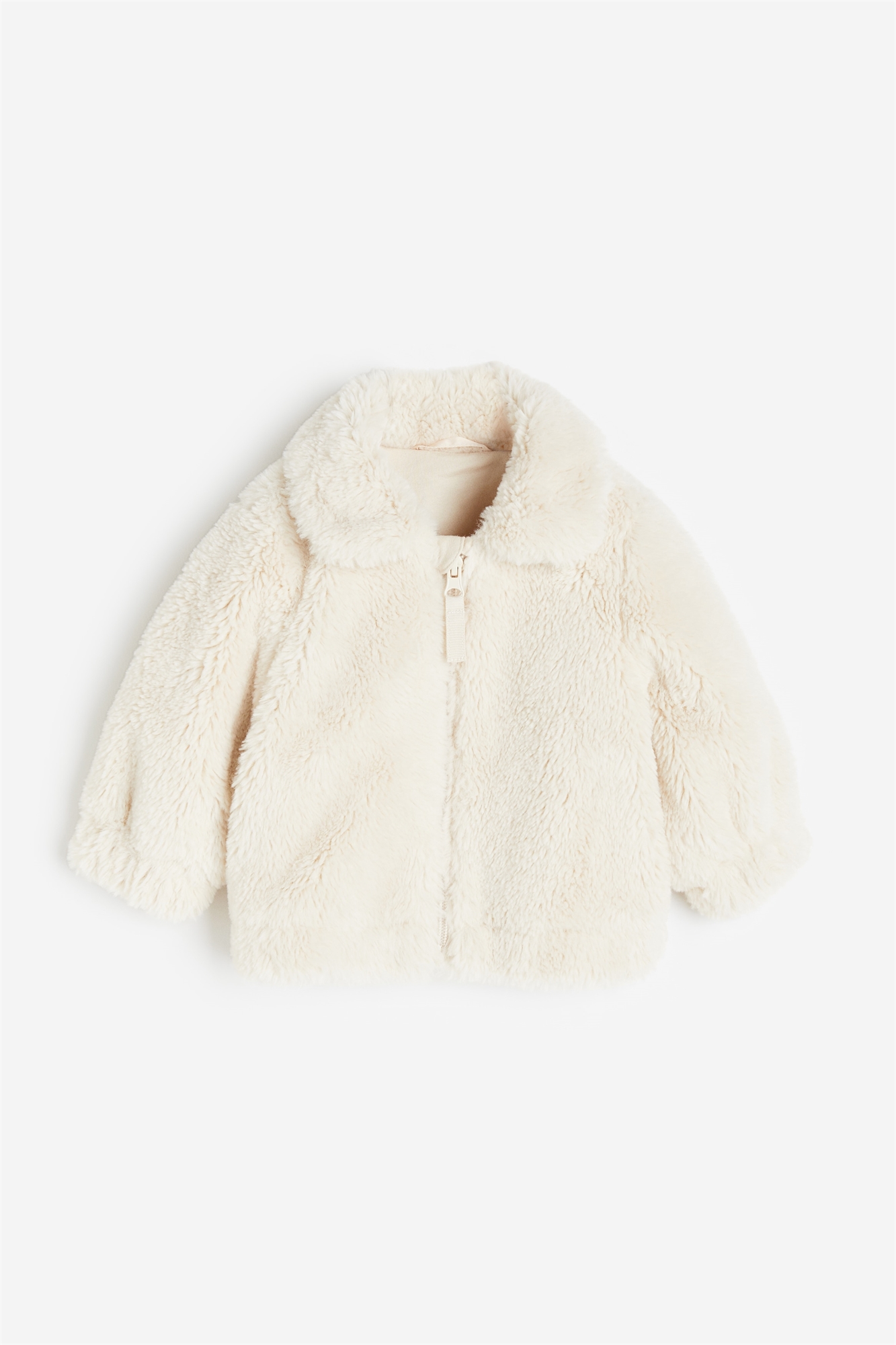 Куртка из мягкого пушистого материала с отложным воротником, застежкой на молнию с защитой подбородка и эластичными манжетами и подолом. На подкладке.