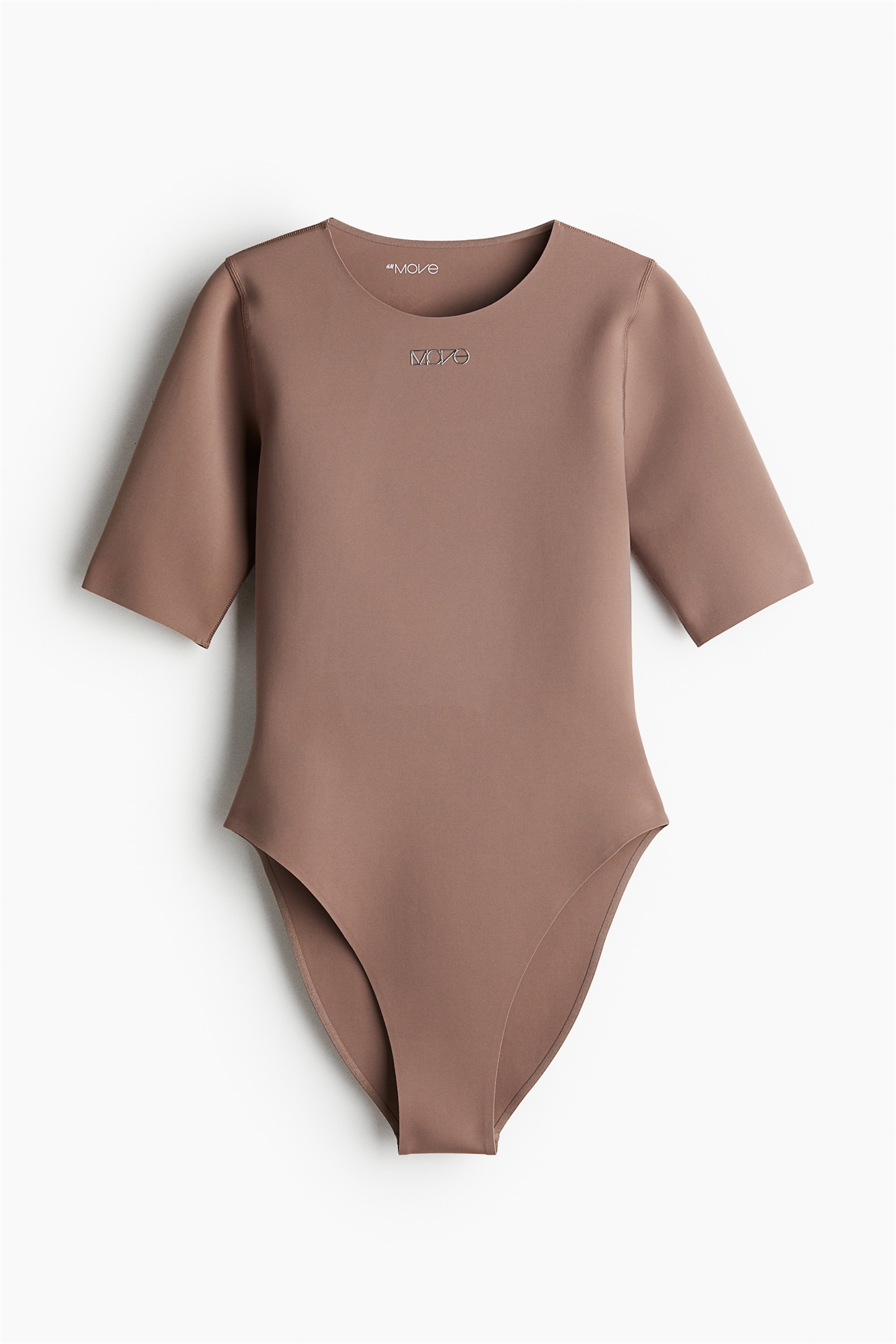 Спортивный купальник с короткими рукавами из ткани скуба идеально подходит для занятий водными видами спорта и плавания. Круглый вырез, вырез на спине и чистый крой, склеенные края для бесшовного и комфортного ощущения на коже. Высокий разрез на ногах, ластовица на подкладке и средняя степень защиты сзади.