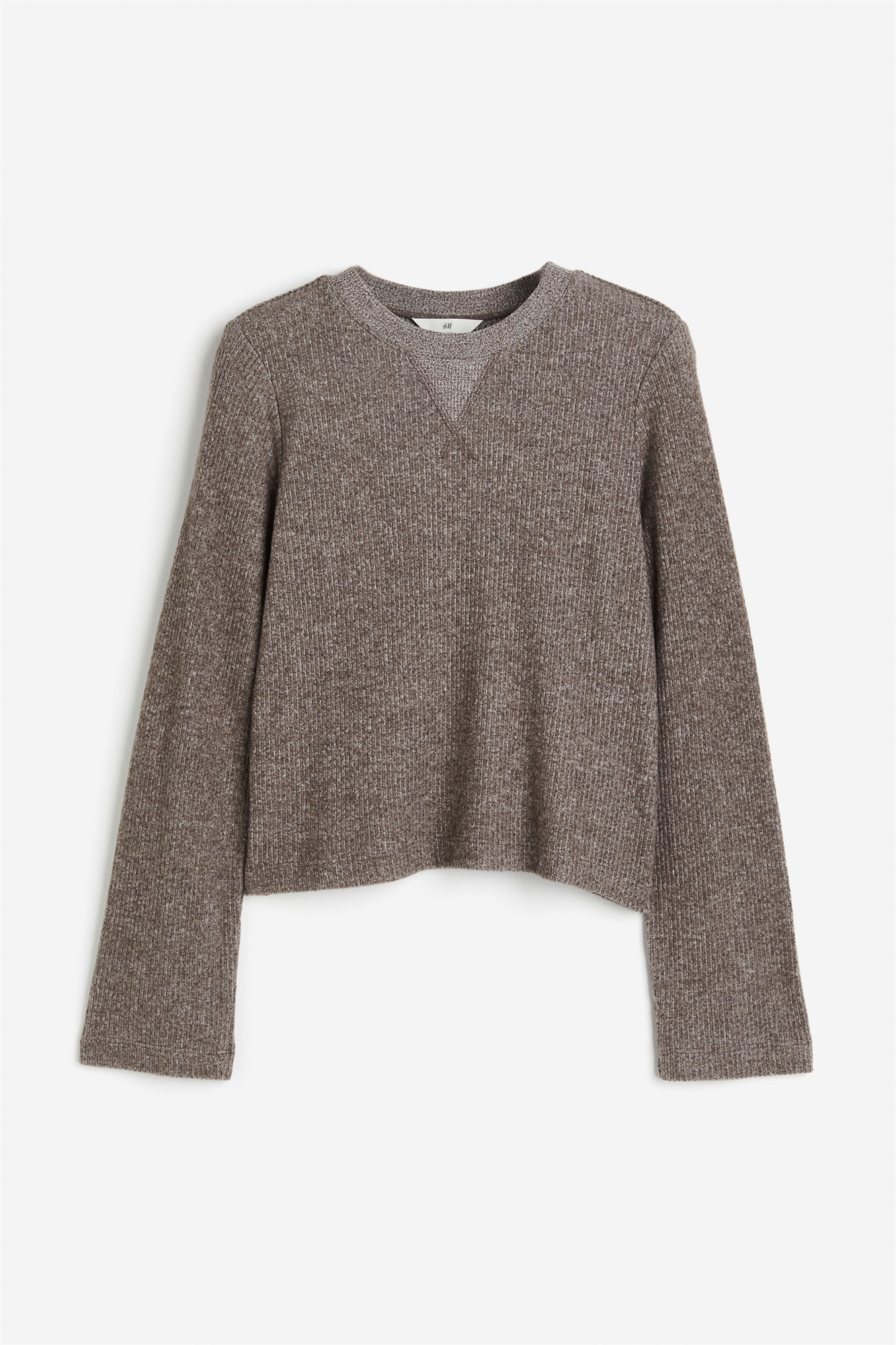 Короткий топ из мягкого ребристого трикотажа с матовой отделкой, круглым ребристым вырезом и длинными рукавами.