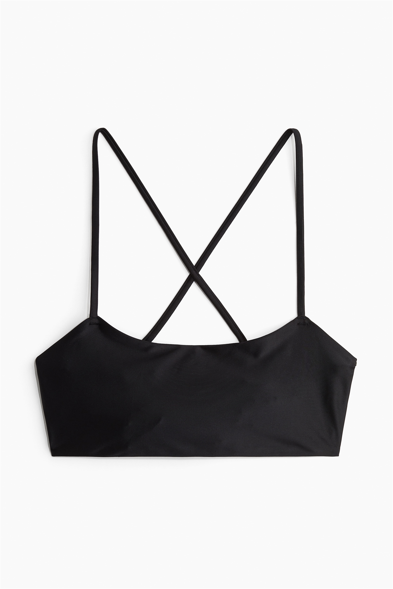 Бикини на подкладке, без проводов, с узкими бретелями, которые перекрещиваются, продеваются через бока и завязываются сзади. Скрытая эластичная резинка на подоле.