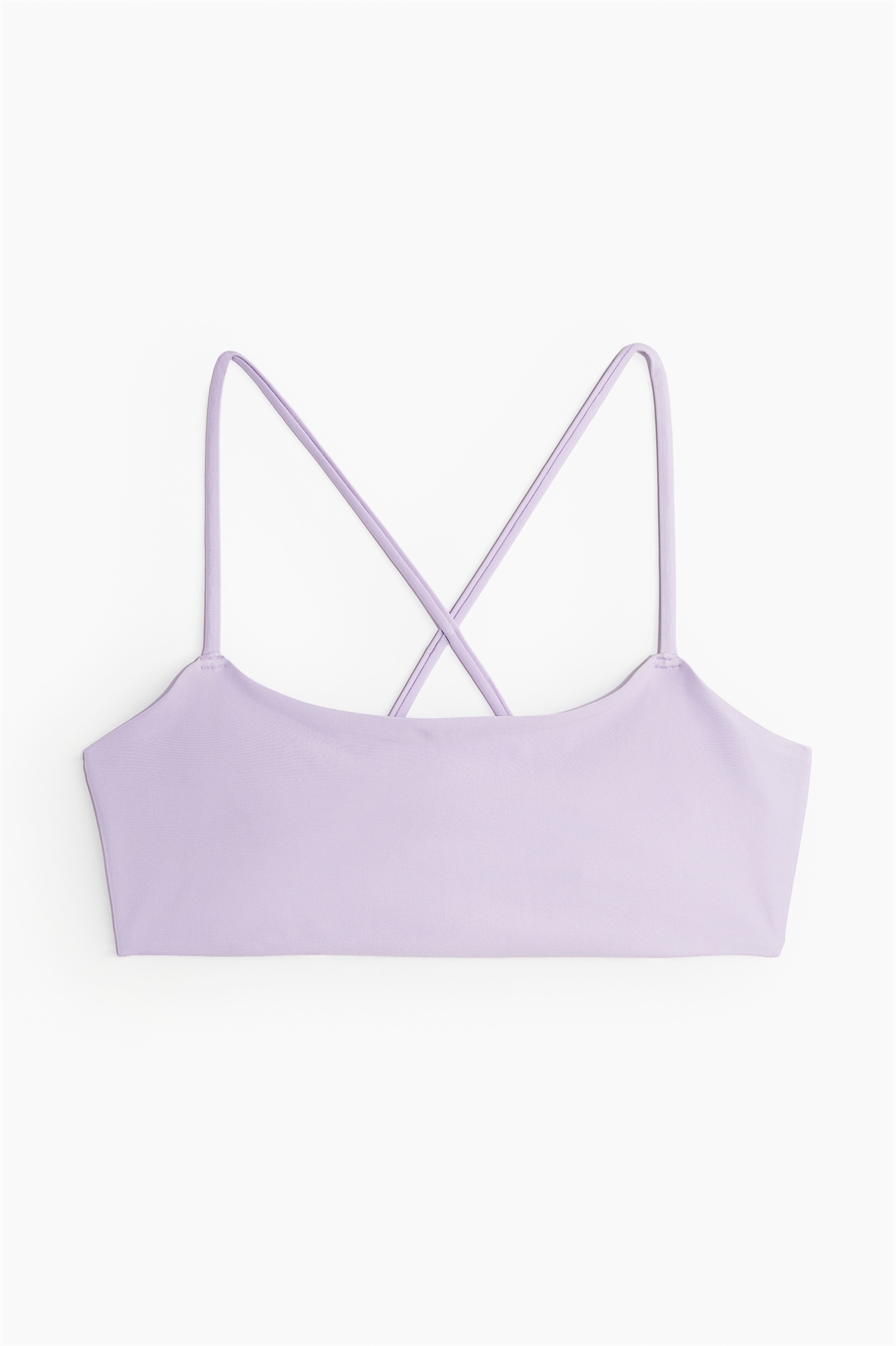 Бикини на подкладке, без проводов, с узкими бретелями, которые перекрещиваются, продеваются через бока и завязываются сзади. Скрытая эластичная резинка на подоле.