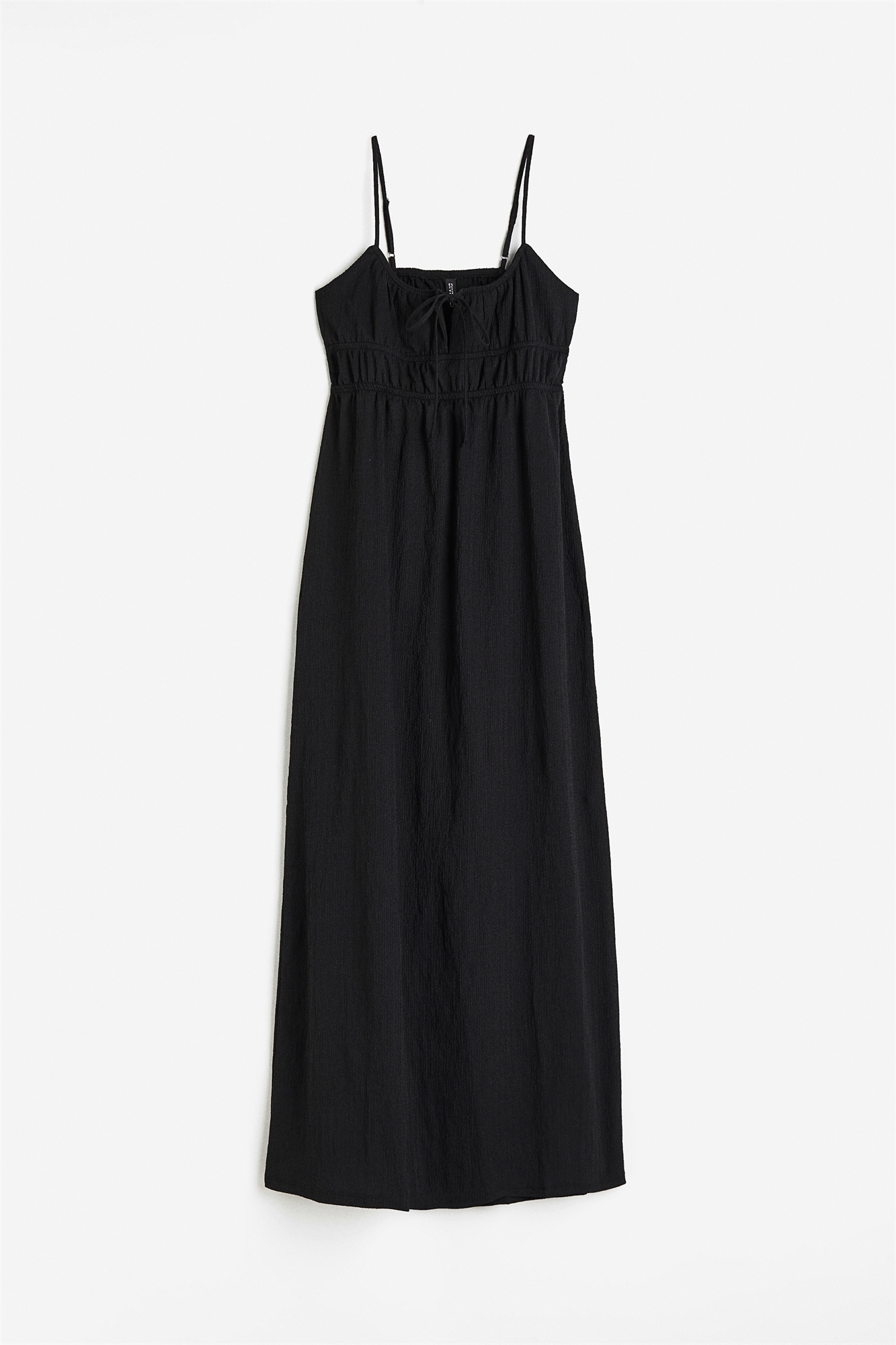 Платье длиной до щиколоток из мятого джерси с глубоким круглым вырезом, небольшим отверстием и узкими завязками спереди. Узкие регулируемые бретели и узкая резинка на талии. Облегающий лиф и слегка расклешенная юбка.