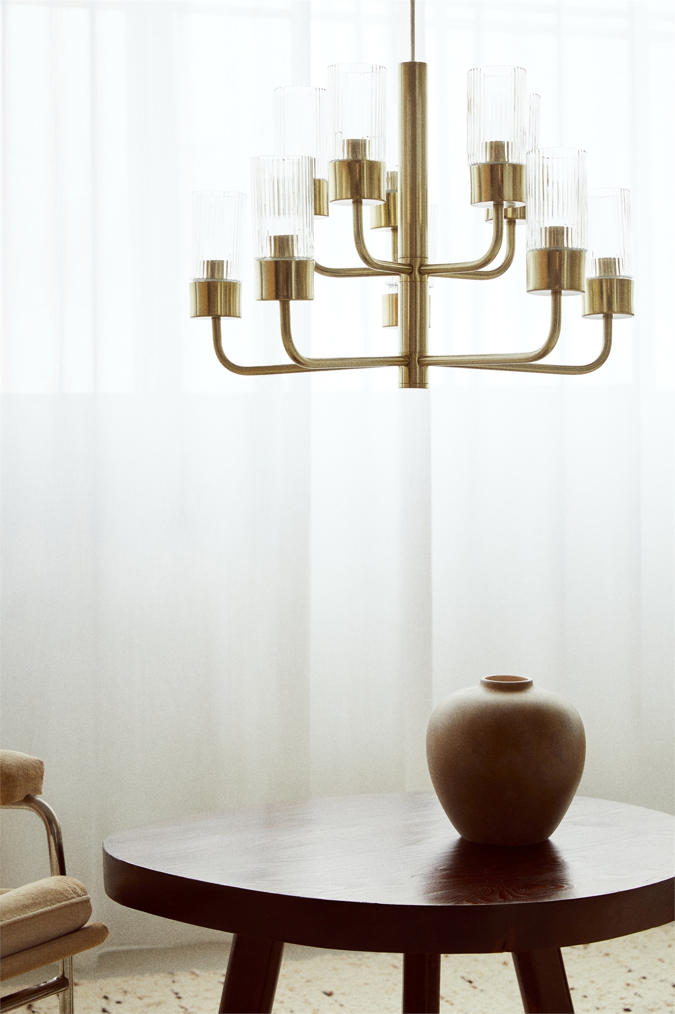 Люстра из металла цвета латуни с десятью ветвями, отходящими от центра в два яруса. Современный дизайн с абажурами из прозрачного рифленого стекла. Металлический корпус. Обитый тканью шнур регулируемой длины и десять патронов E14. Максимальная мощность 6 Вт. Лампочки и вилка в комплект не входят. Диаметр абажура 5,4 см. Ширина около 60 см. Общая высота 36 см. Длина шнура 200 см.