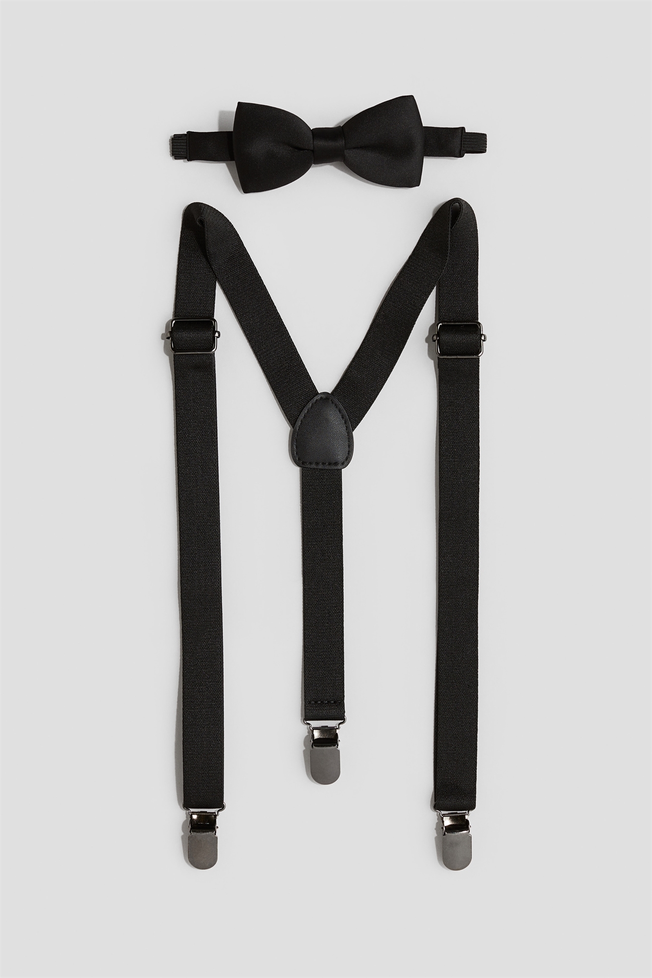 Комплект из пары брекетов и галстука-бабочки. Регулируемые эластичные брекеты с металлическими застежками. Галстук-бабочка из тканого материала с регулируемым ремешком и пластиковой застежкой сзади.