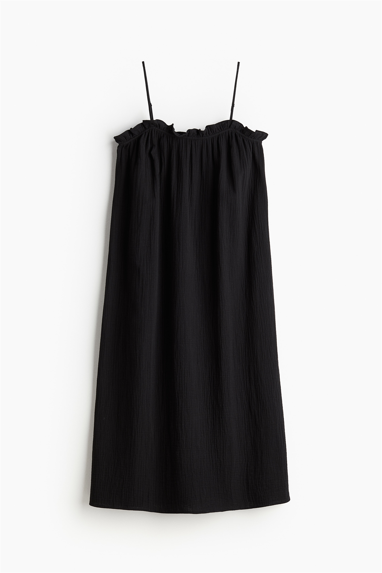 Длинное платье свободного покроя из воздушного хлопкового полотна с узкими регулируемыми бретелями и оборкой по верху. Без подкладки.