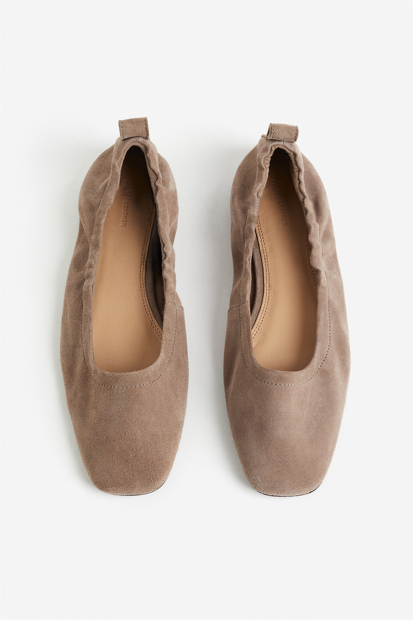 Балетки с квадратным носком из мягкой замши с петлей и эластичной вставкой сзади. Кожаные подкладка и стелька.