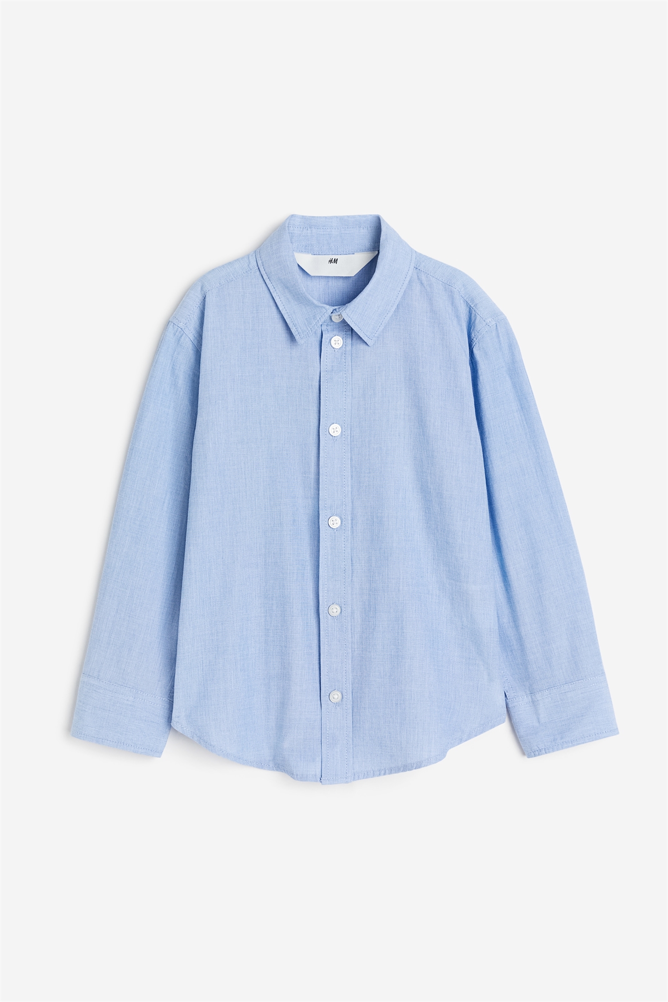 Рубашка из хлопкового полотна с отложным воротником, застежкой на пуговицы спереди, передом и длинными рукавами с манжетами на пуговицах. Закругленный подол.