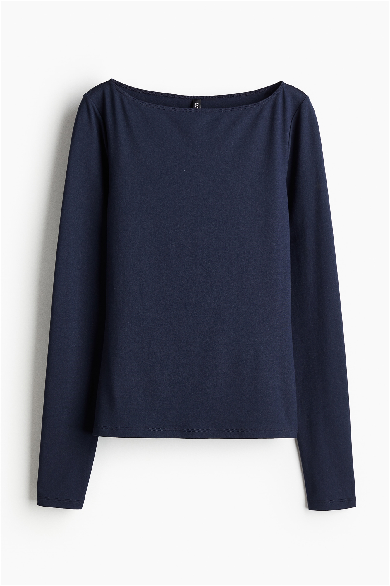 Облегающая футболка из эластичного джерси с вырезом-лодочкой, длинными рукавами и прямым подолом.