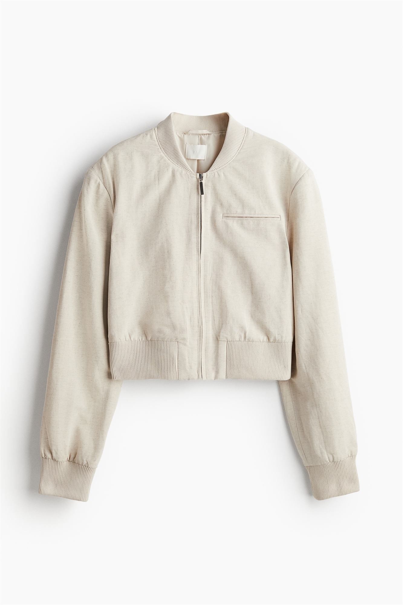 Куртка-бомбер кроп из тканого материала с небольшим ребристым воротником и застежкой спереди. Накладки на плечах, длинные рукава, манжеты и подол в рубчик. На подкладке.