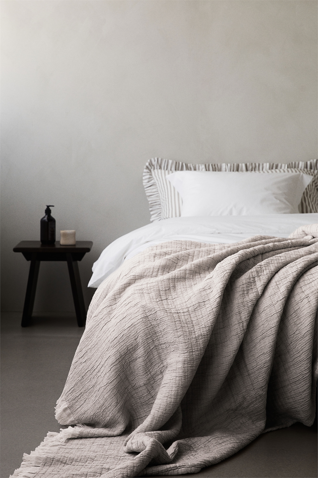 Односпальное покрывало из хлопковой смеси с воздушным, мягким плетением и бахромой по коротким сторонам.