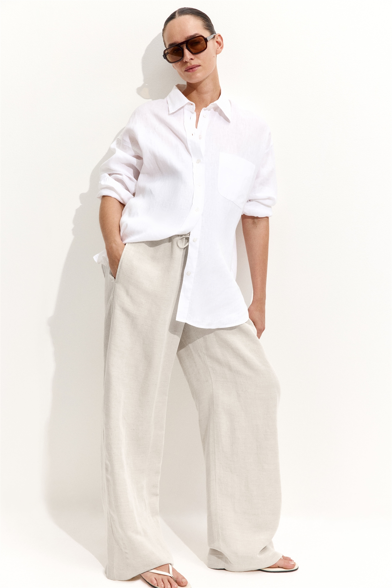 Свободные брюки с воздушным плетением из смеси льна и вискозы. Заниженная талия с утяжкой и узким шнурком для комфортной посадки во время и после беременности. Незаметные боковые карманы и широкие штанины.