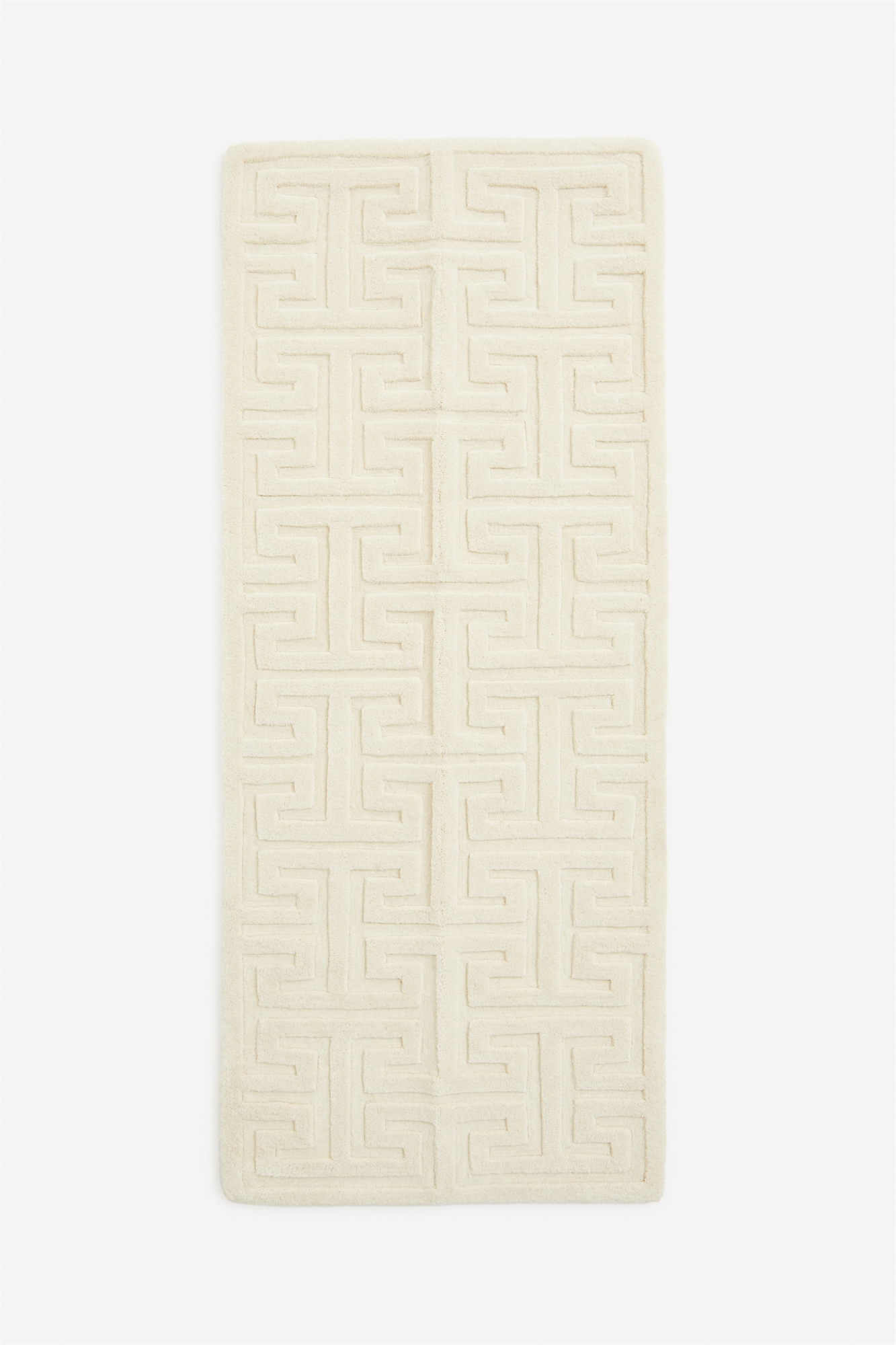 Ковер из шерсти с геометрическим узором. Длинный ворс создает ощущение мягкости и уюта под ногами, создавая теплую и комфортную атмосферу в вашем доме.