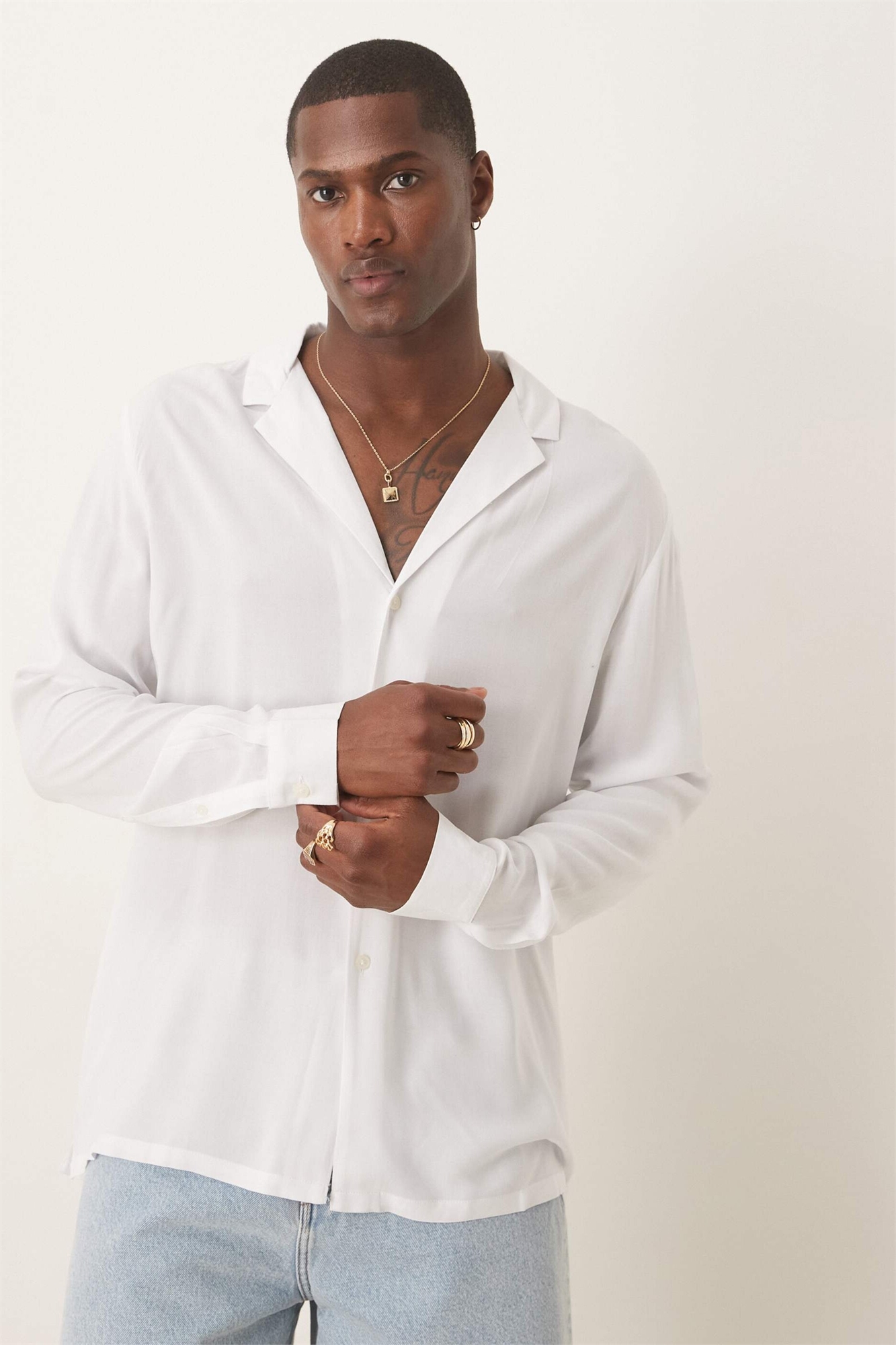 Приталенная вискозная рубашка с глубоким воротником-ревер