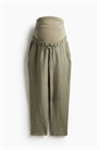 Брюки из льна и вискозы с эластичной отделкой и узким шнурком на талии. Диагональные боковые карманы и зауженные ноги длиной до щиколотки. Широкая панель из джерси на талии для лучшей посадки на животе.