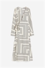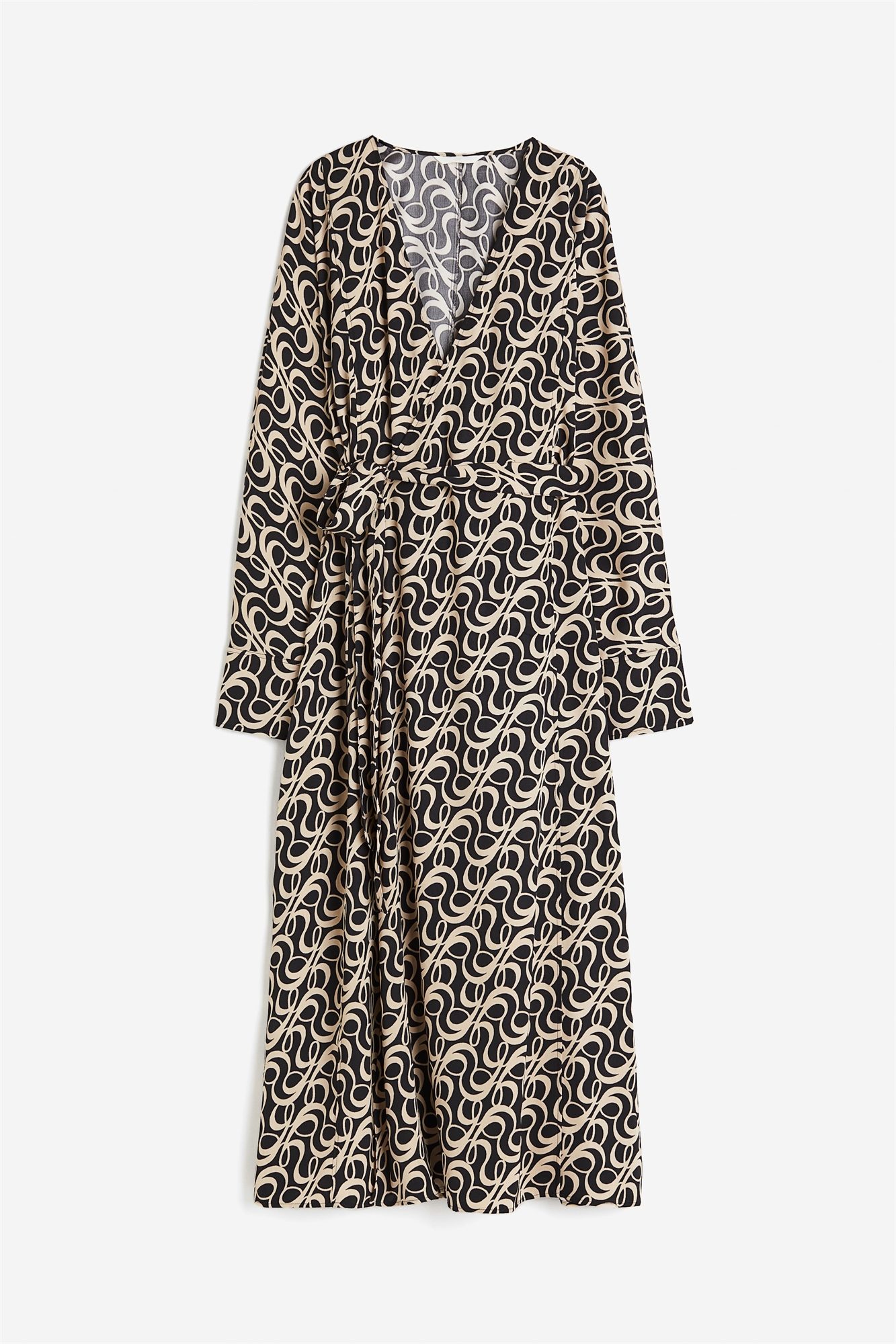 Платье длиной до колена из тканого материала с легким блеском. Глубокий V-образный вырез и облегающий перед с завязывающимся поясом на талии. Длинные рукава и широкие манжеты с разрезом и пуговицей. Без подкладки.