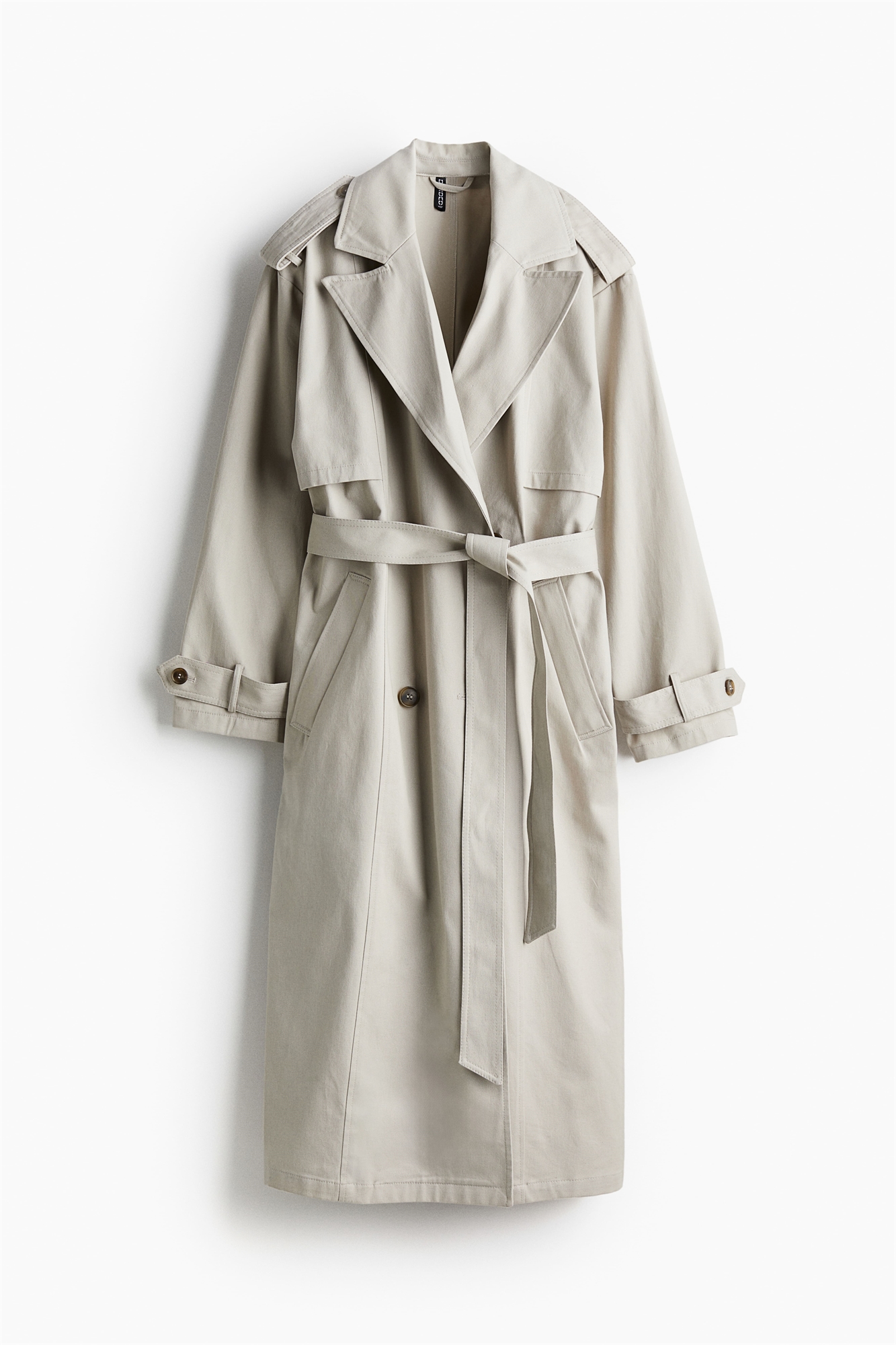 Длинный двубортный тренч из хлопковой саржи с отложным воротником и широкими лацканами. Штормовые клапаны, накладки на плечах с пуговицей, кнопки спереди и съемный пояс на талии. Манжеты с пуговицей, диагональные карманы спереди и один задний клапан. Без отделки.