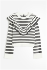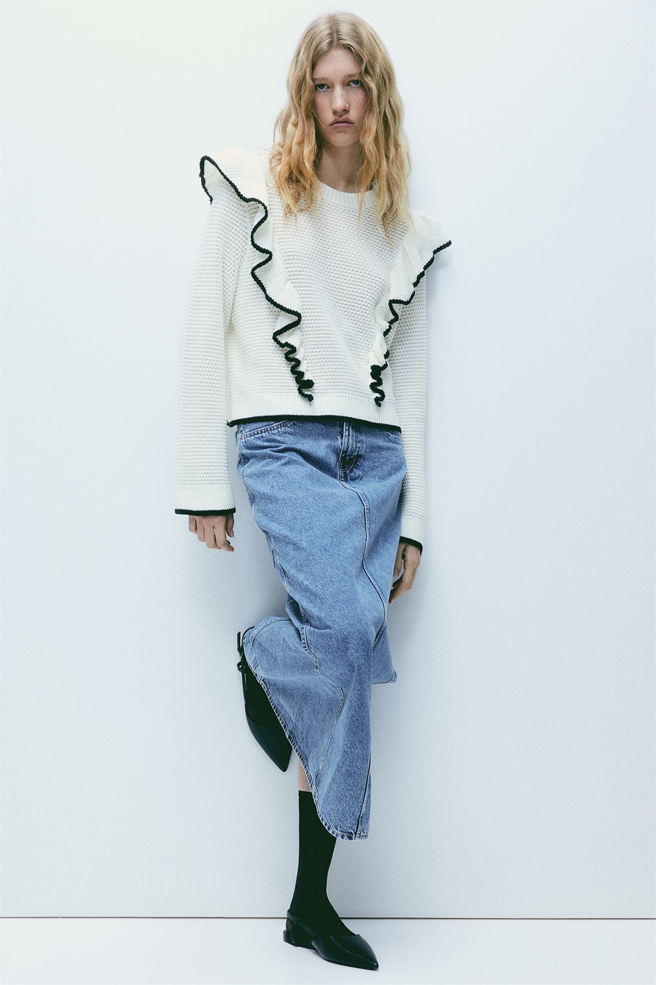 Джемпер из фактурного трикотажа с круглым вырезом в рубчик и отделкой оборками спереди, переходящими на плечи. Длинные рукава и окантовка манжет и подола.