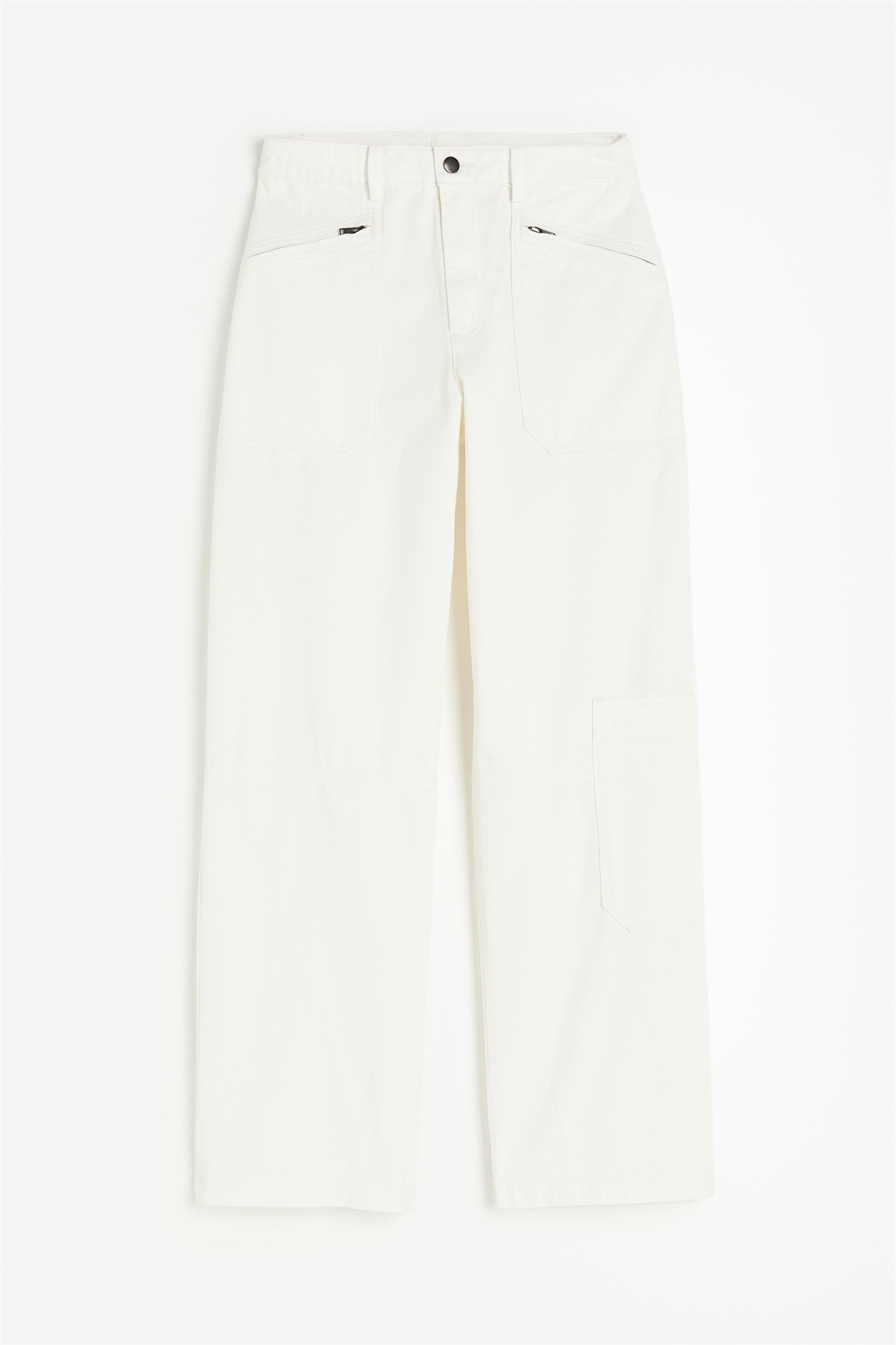 Брюки из хлопковой саржи с высокой талией, застежкой на молнию и пуговицу, передними карманами на молнии, открытыми задними карманами и накладным карманом на ноге. Прямые ноги со швом ниже колен.
