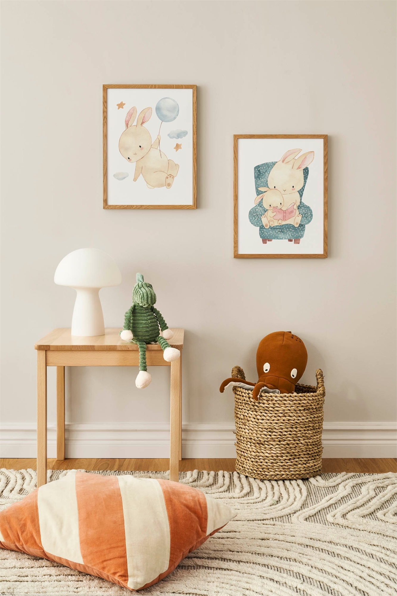 Причудливый постер с ручной акварельной росписью, на котором изображен кролик, летящий по воздуху с помощью воздушного шара.