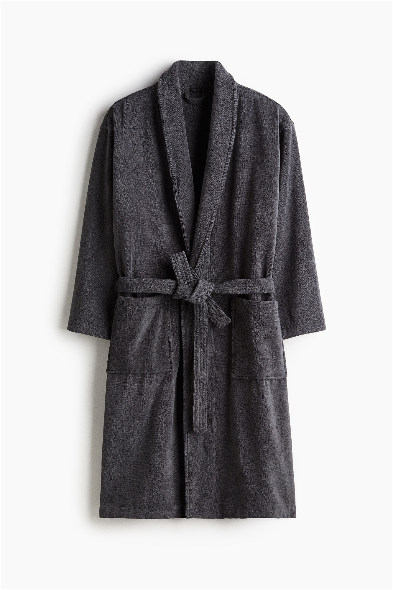 Халат из мягкой хлопковой махры с шалевым воротником, передними карманами и съемным поясом-завязкой на талии.