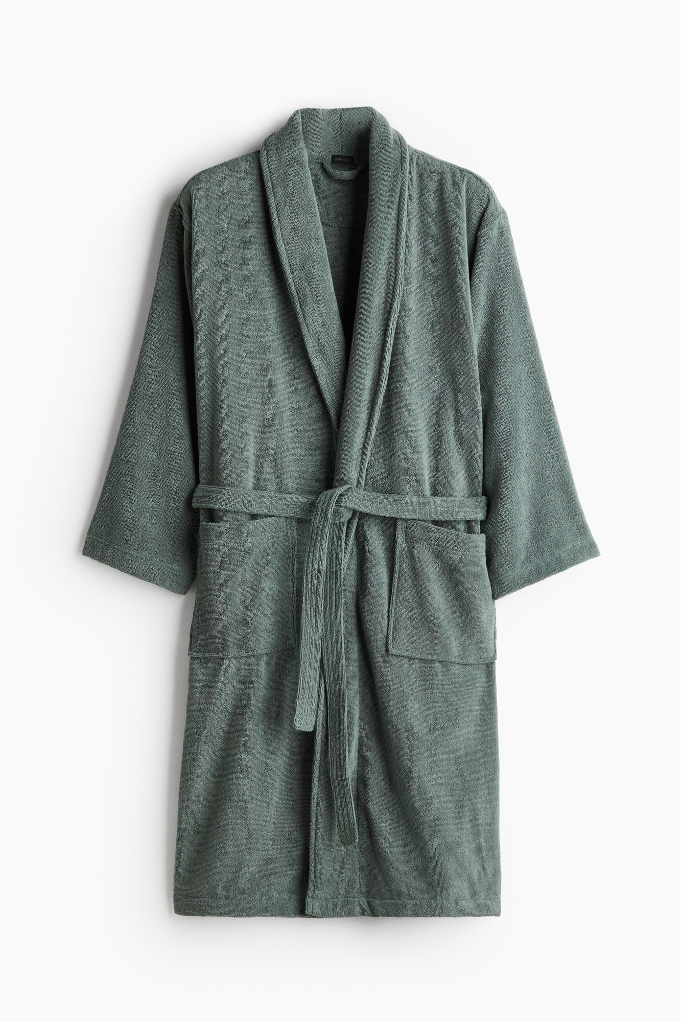 Халат из мягкой хлопковой махры с шалевым воротником, передними карманами и съемным поясом-завязкой на талии.