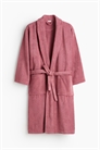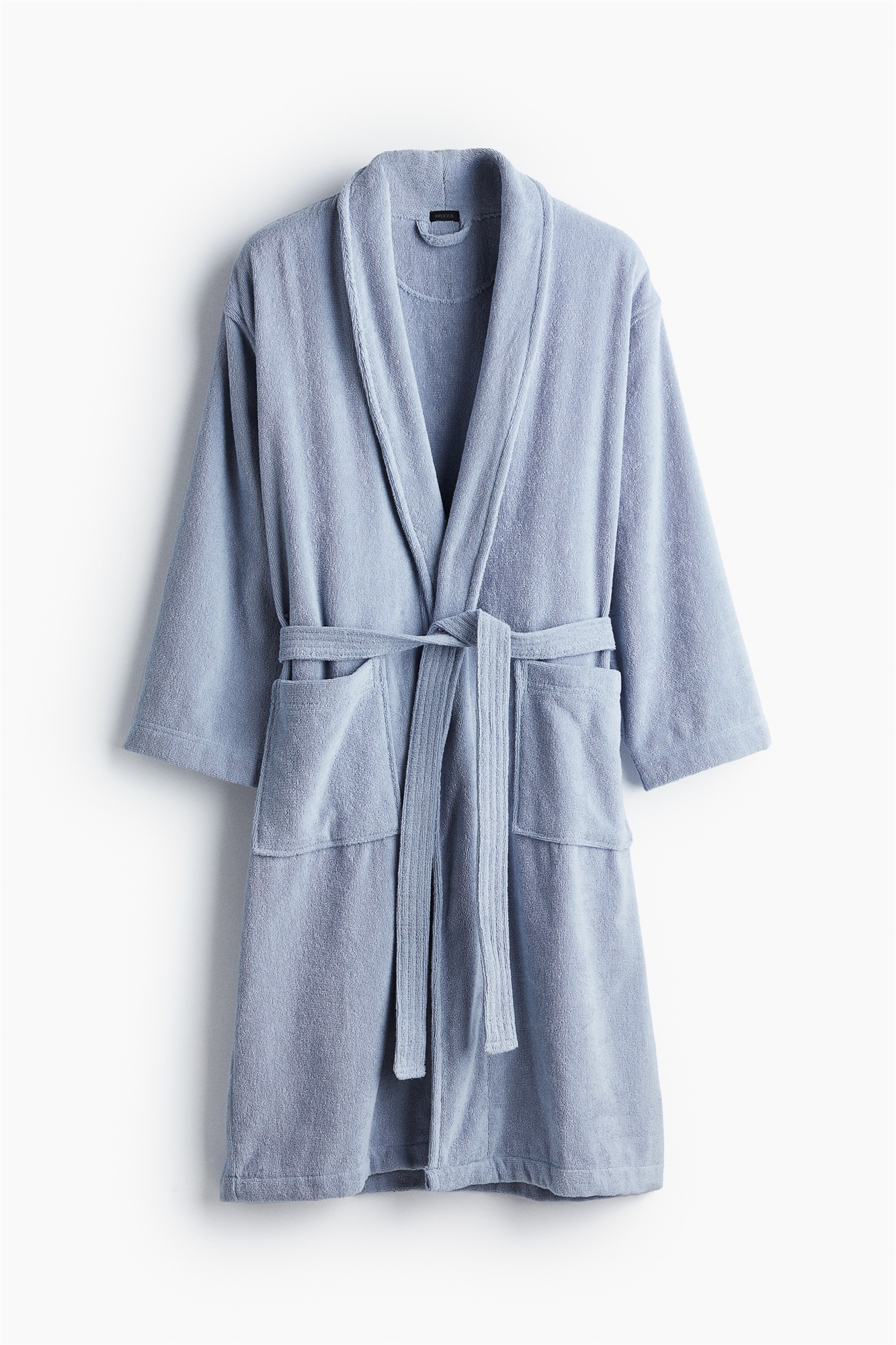 Халат из мягкой хлопковой махры с шалевым воротником, передними карманами и съемным поясом-завязкой на талии.