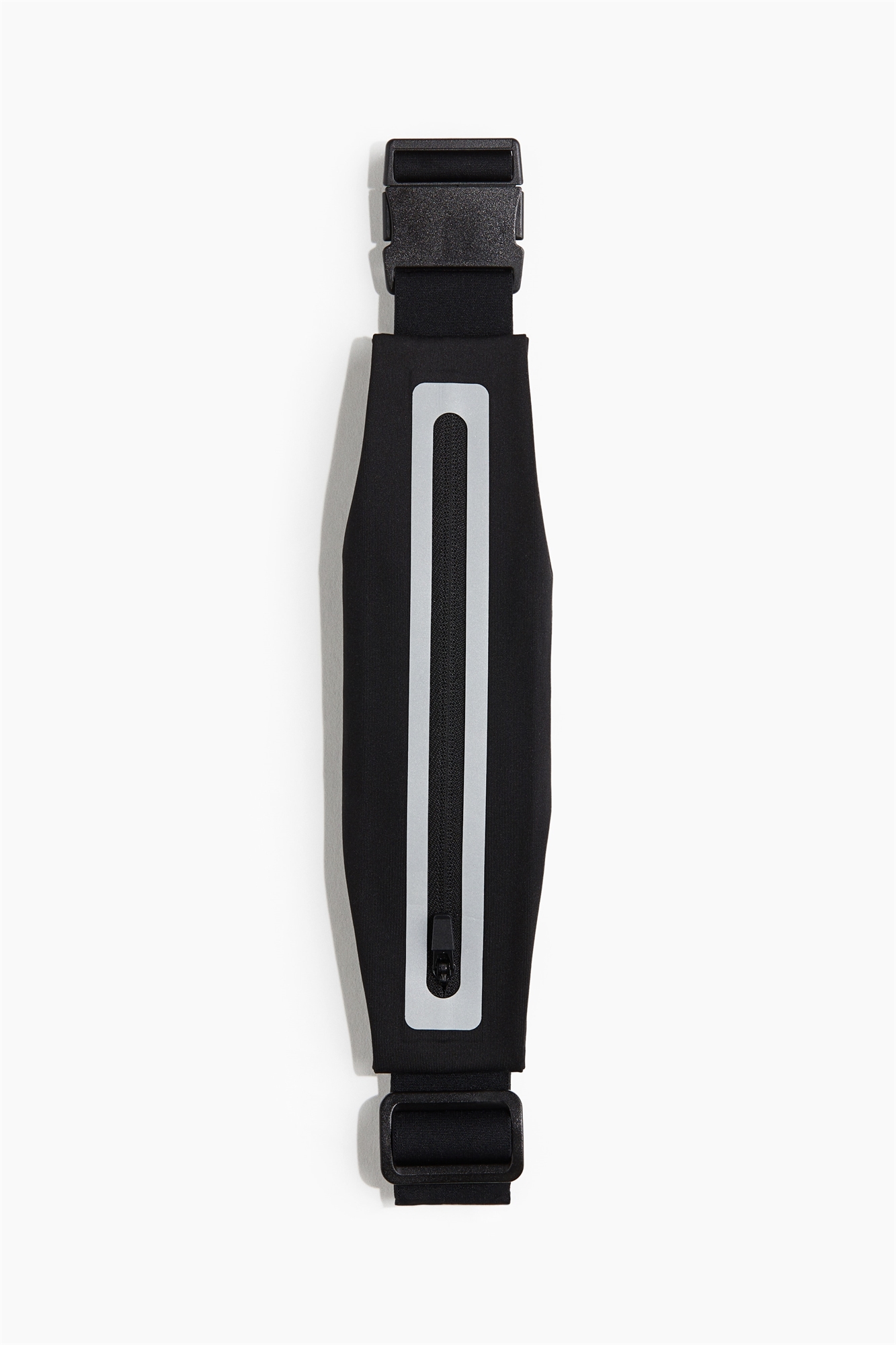 Поясная сумка для бега с карманом на молнии и светоотражающей деталью спереди. Регулируемый эластичный ремень с пластиковой пряжкой.