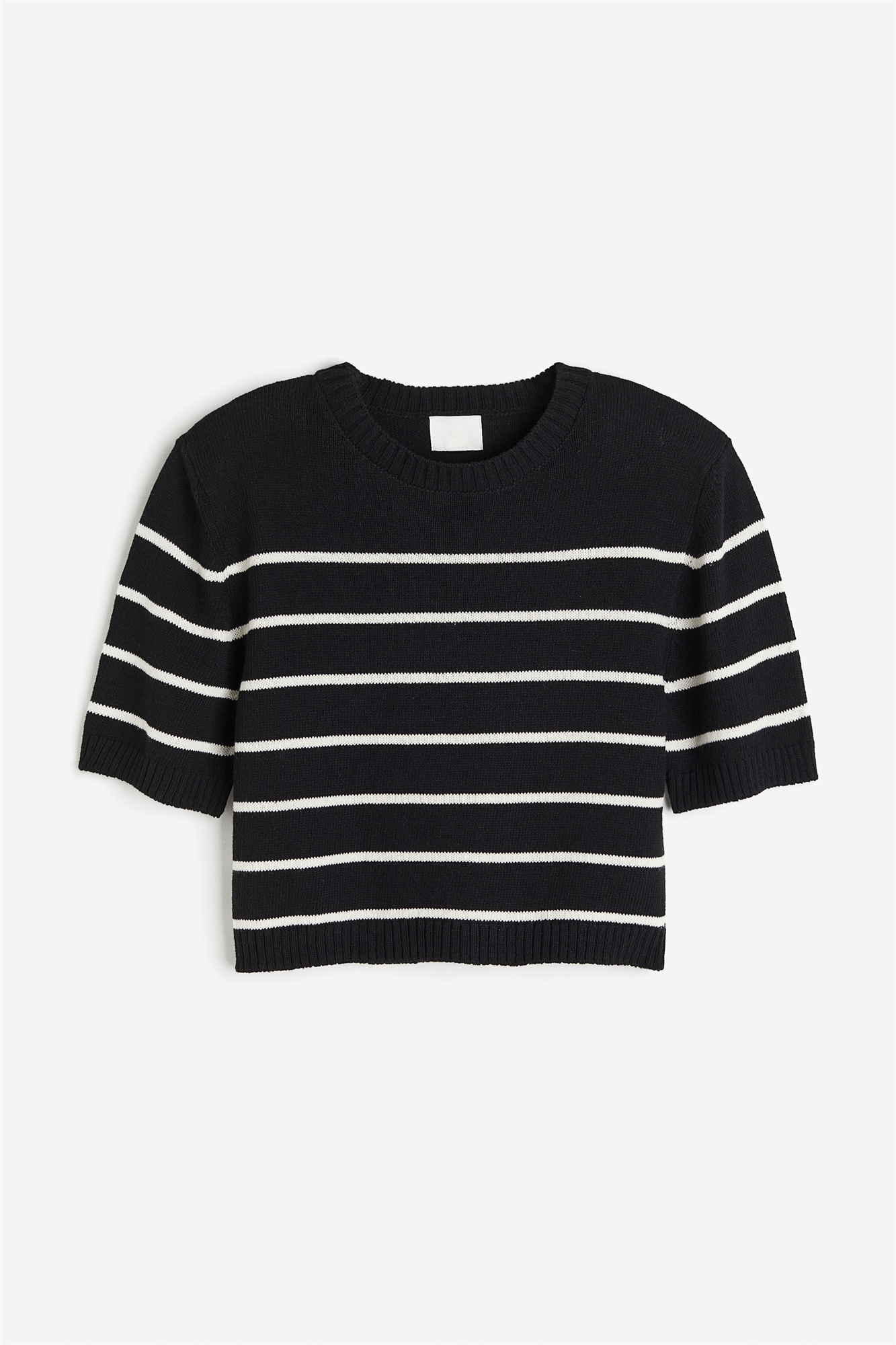 Короткий приталенный топ из мягкого трикотажа из смеси хлопка с круглым вырезом, подплечниками и короткими рукавами. Окантовка по вырезу, манжетам и подолу.