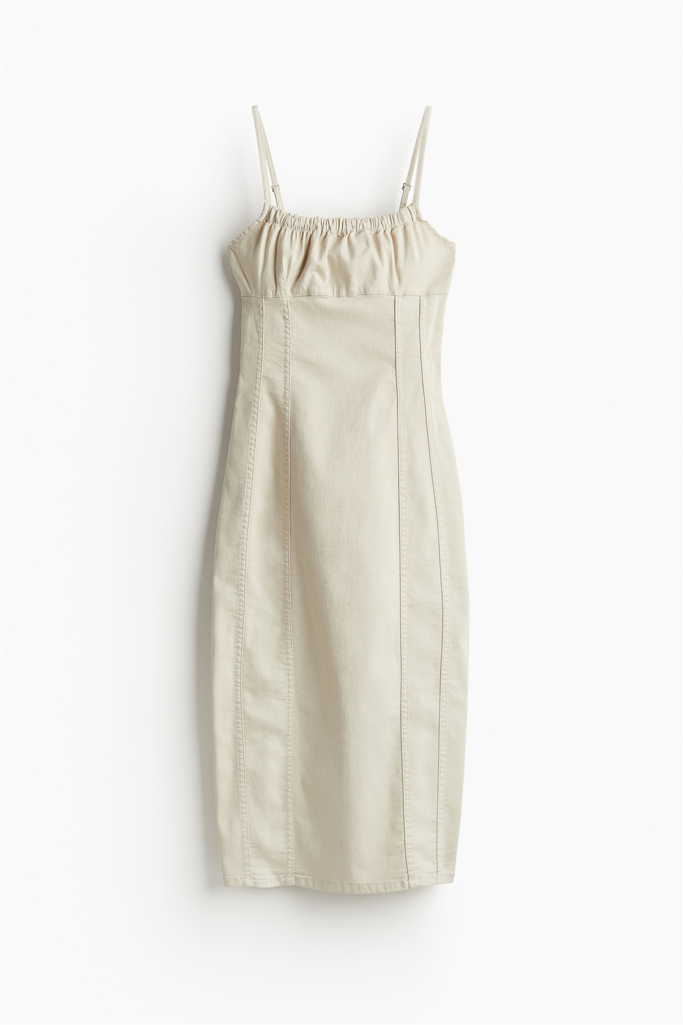 Приталенное платье длиной до колена из эластичного денима с узкими регулируемыми бретелями и квадратным вырезом с эластичной отделкой. Шов под бюстом, потайная застежка-молния сзади и видимые швы спереди и сзади. Подол прямого кроя с высоким разрезом сзади.