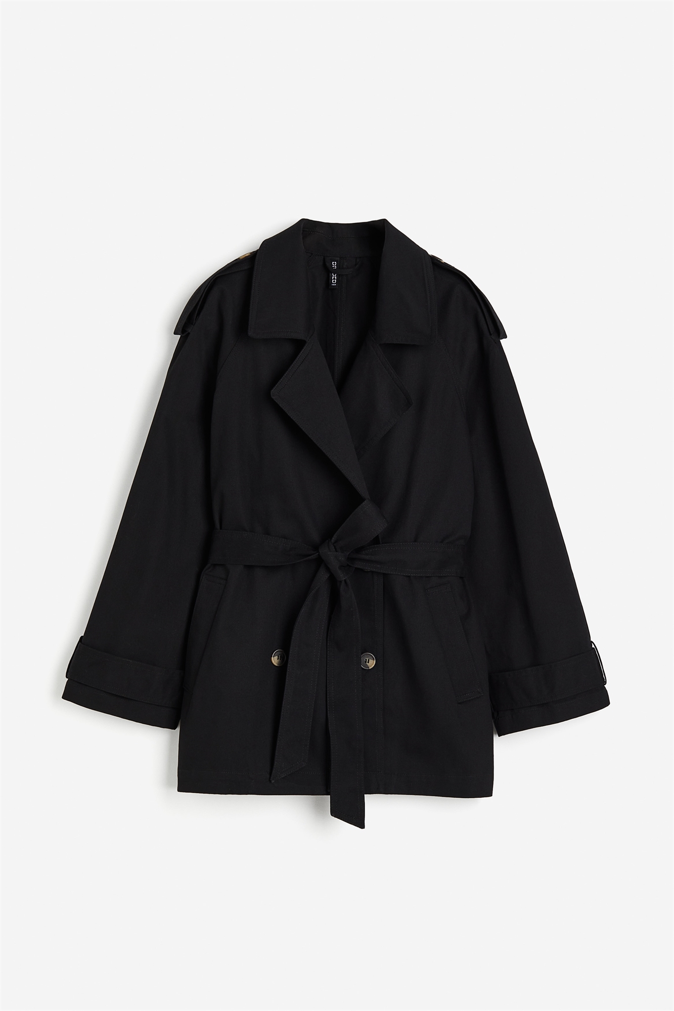 Короткий двубортный тренч из хлопковой саржи с отложным воротником, лацканами с вырезом, пуговицами спереди и застежками на пуговицах на плечах. Свободный крой с длинными рукавами реглан, манжетами с завязками и пуговицами, съемным поясом-завязкой на талии и диагональными карманами спереди.