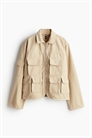 Утилитарная куртка из жесткого хлопкового денима с воротником, застежкой-молнией спереди и ярмом сзади. Свободный крой с опущенными плечами и длинными рукавами, на одном из которых есть карман с клапаном. Сильфонные нагрудные карманы и двойные сильфонные передние карманы с клапаном и застежкой на крючок и петлю.