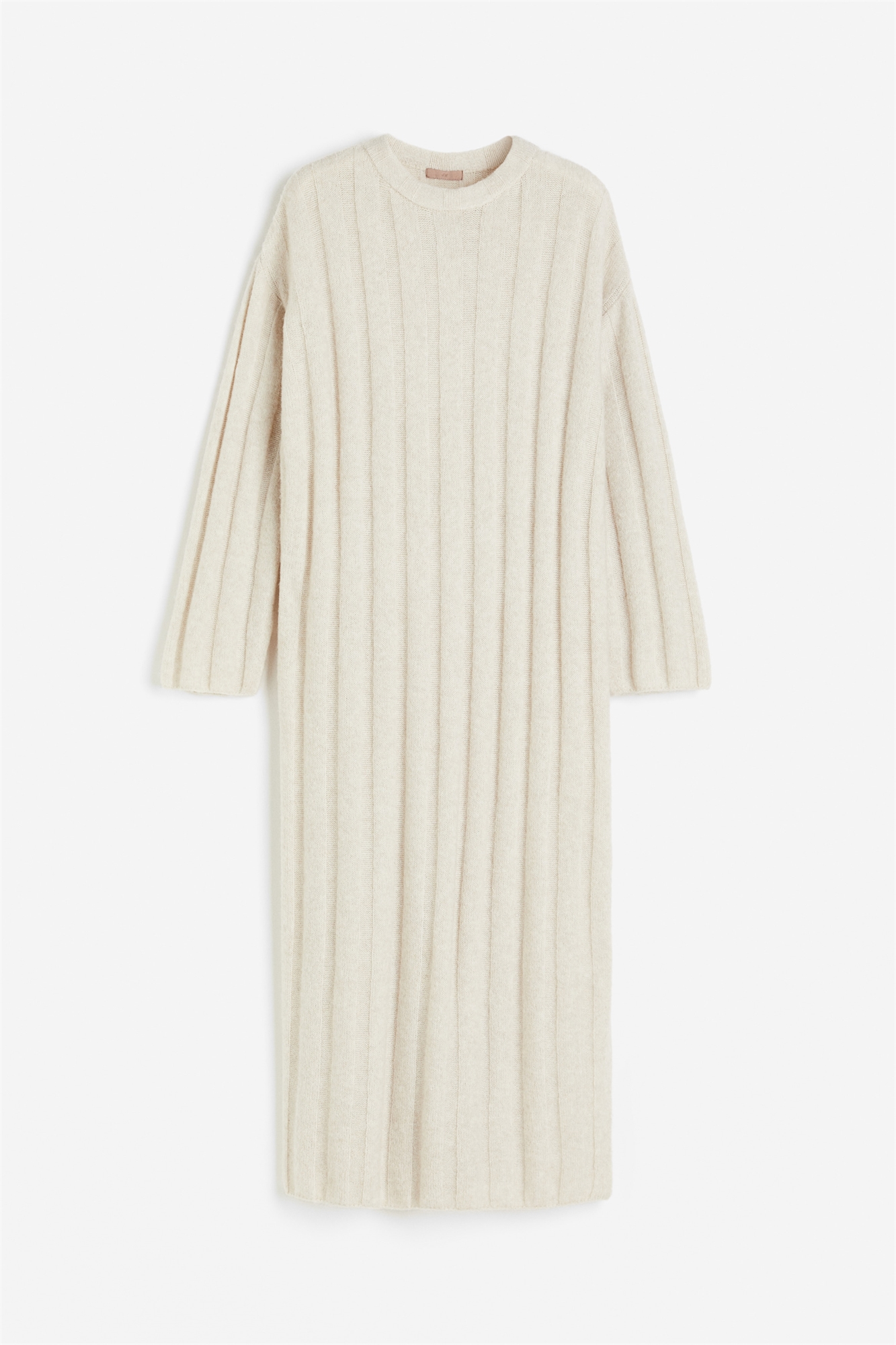 Свободное платье длиной до щиколоток из мягкого трикотажа в рубчик, выполненного из шерстяной смеси. Круглый вырез, спущенные плечи и длинные рукава с разрезом на манжетах. Прямой подол с разрезом с одной стороны.