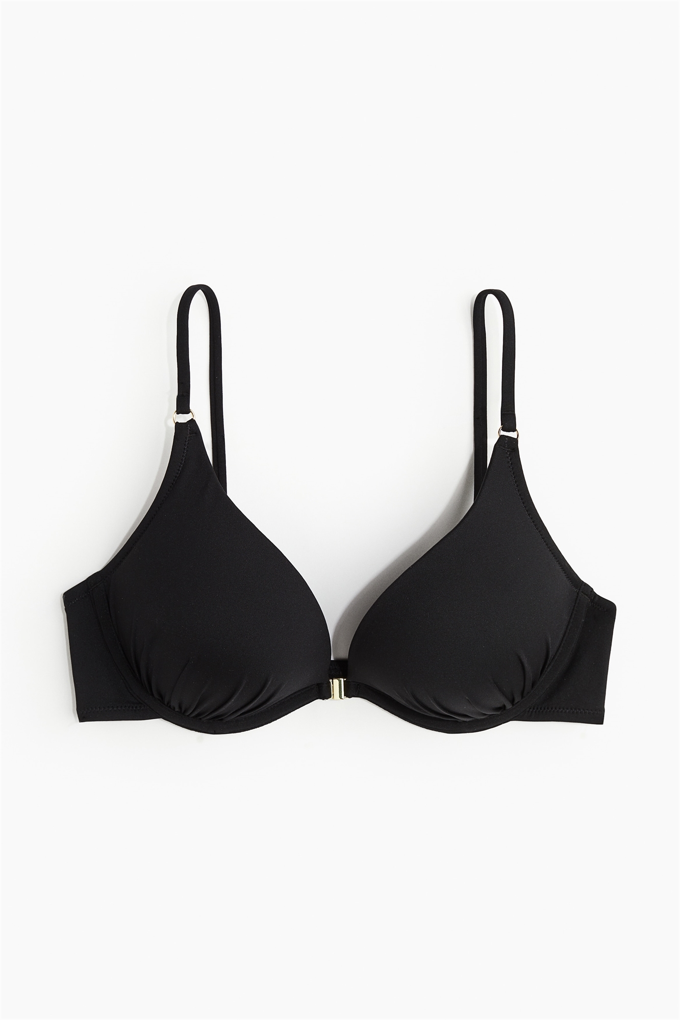 Бикини на подкладке с чашечками с плотной набивкой, которые максимально увеличивают бюст и создают более глубокое декольте. Регулируемые бретели и металлическая застежка по центру бюста.