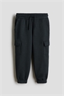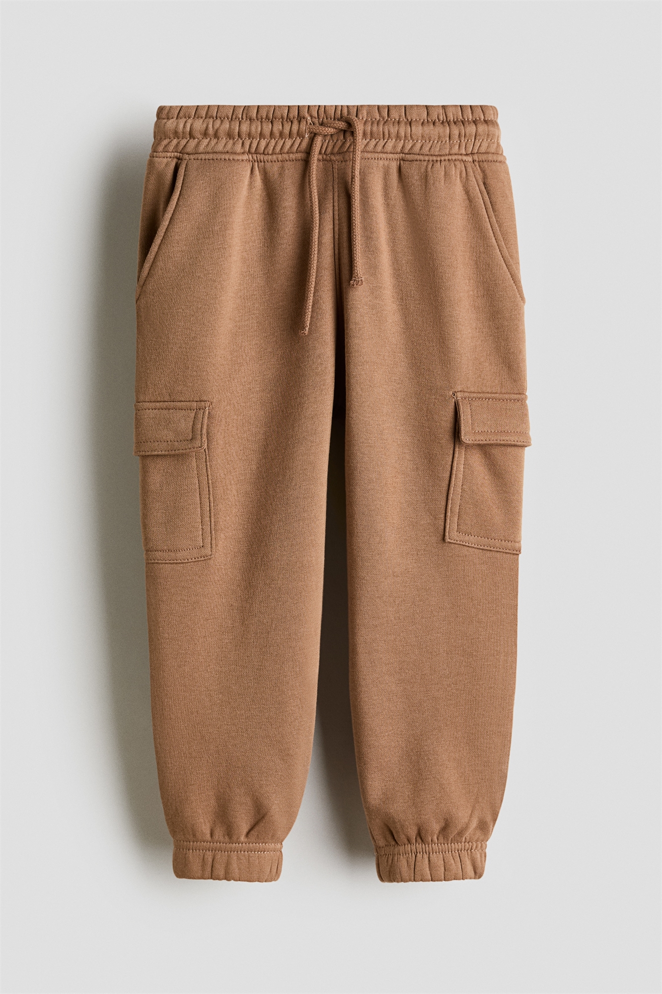 Джоггеры в стиле карго из толстоватой ткани с мягкой ворсистой внутренней стороной. Эластичная талия с утягивающим шнурком, диагональные боковые карманы, накладные карманы на ногах и эластичная резинка по краям.