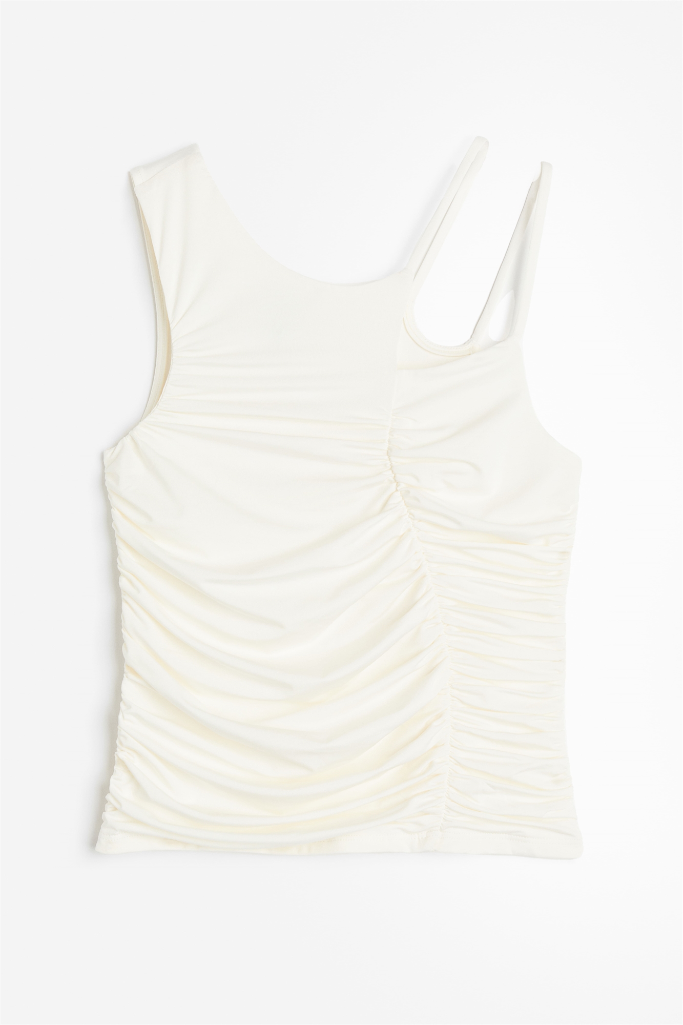 Короткий приталенный топ из джерси-стрейч с широкой бретелью на одном плече и двойными узкими бретелями на другом. Изогнутый, собранный шов спереди и собранные боковые швы создают эффект легкой драпировки.