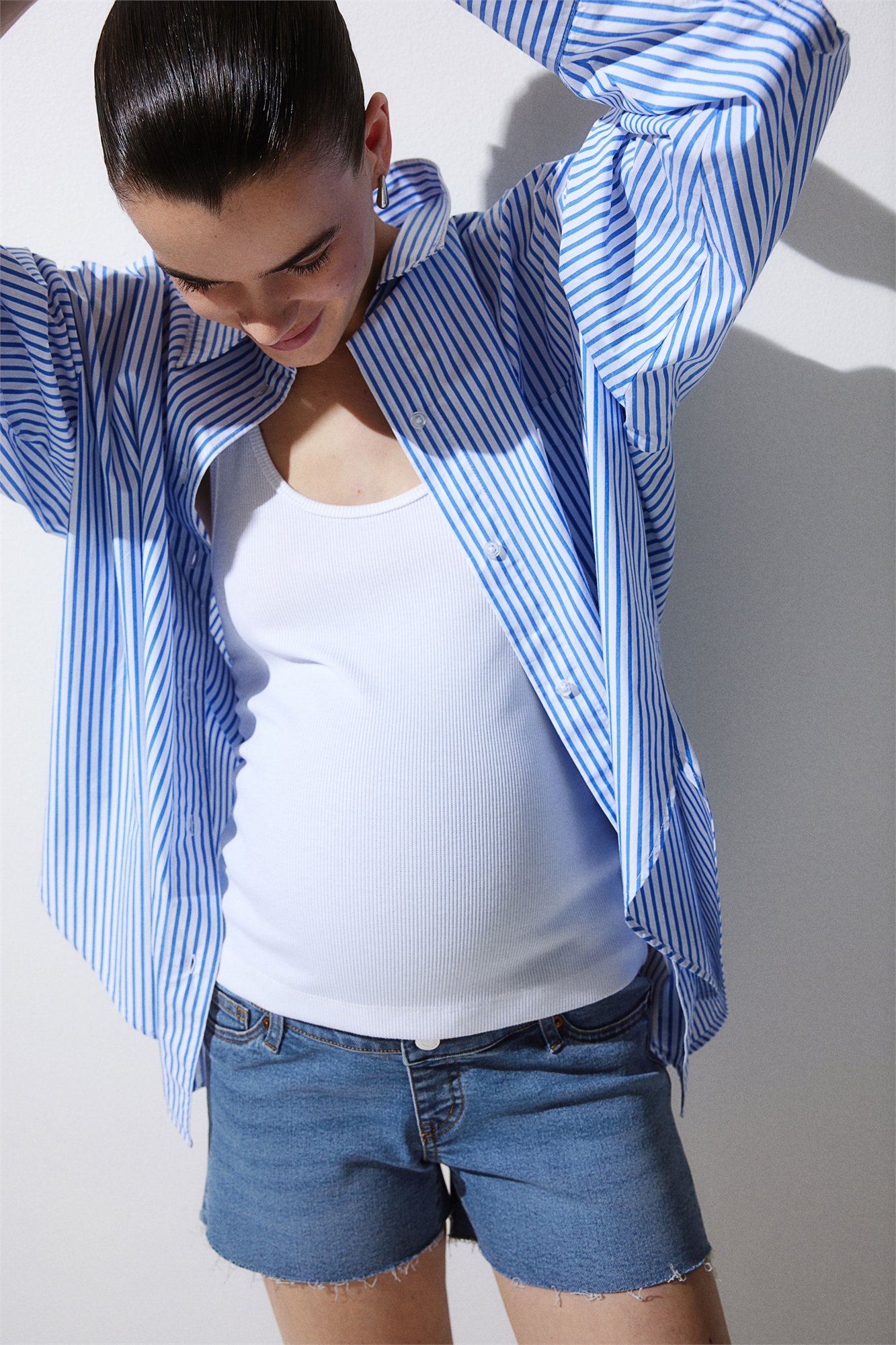 Шорты из хлопкового денима с фальшивыми передними карманами, настоящим карманом для монет и настоящими задними карманами. Фальшивая ширинка с пуговицей и необработанные края. Широкая панель из джерси на талии для лучшей посадки на животе.