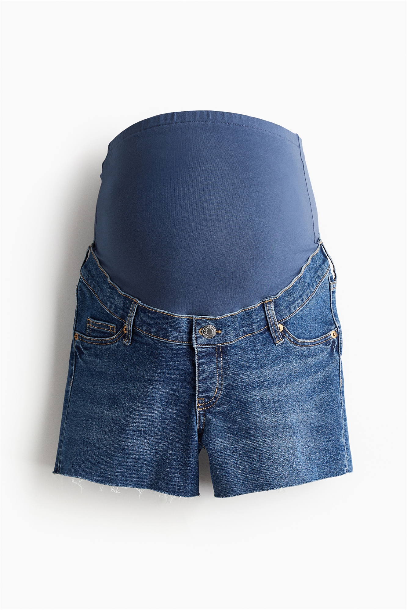 Шорты из хлопкового денима с фальшивыми передними карманами, настоящим карманом для монет и настоящими задними карманами. Фальшивая ширинка с пуговицей и необработанные края. Широкая панель из джерси на талии для лучшей посадки на животе.