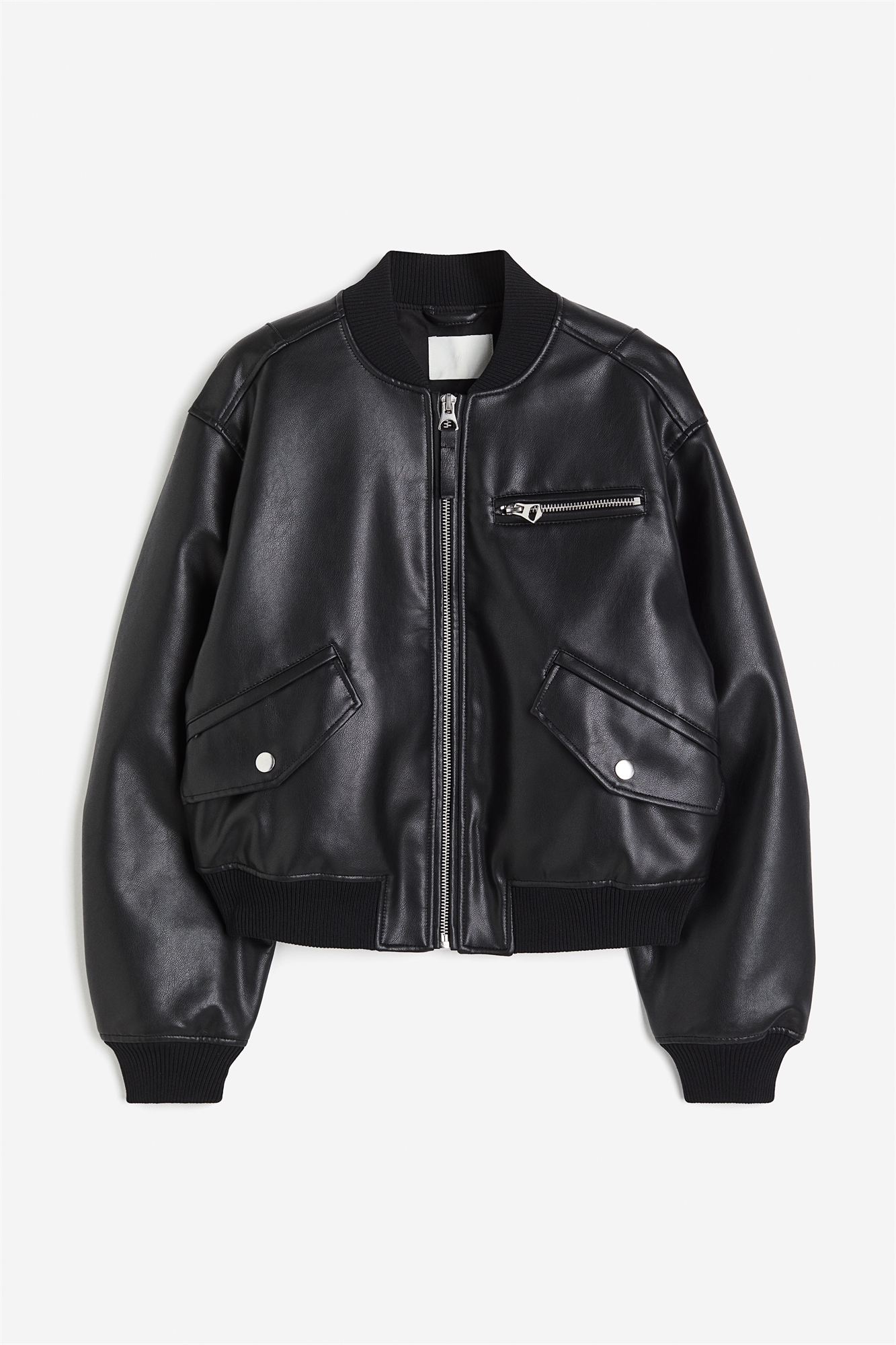 Куртка-бомбер из мелованной ткани с небольшим ребристым воротником и застежкой на молнию спереди. Свободный крой, слегка спущенные плечи, нагрудный карман на молнии и накладные передние карманы с кнопкой. Ребристые манжеты и подол. На подкладке.