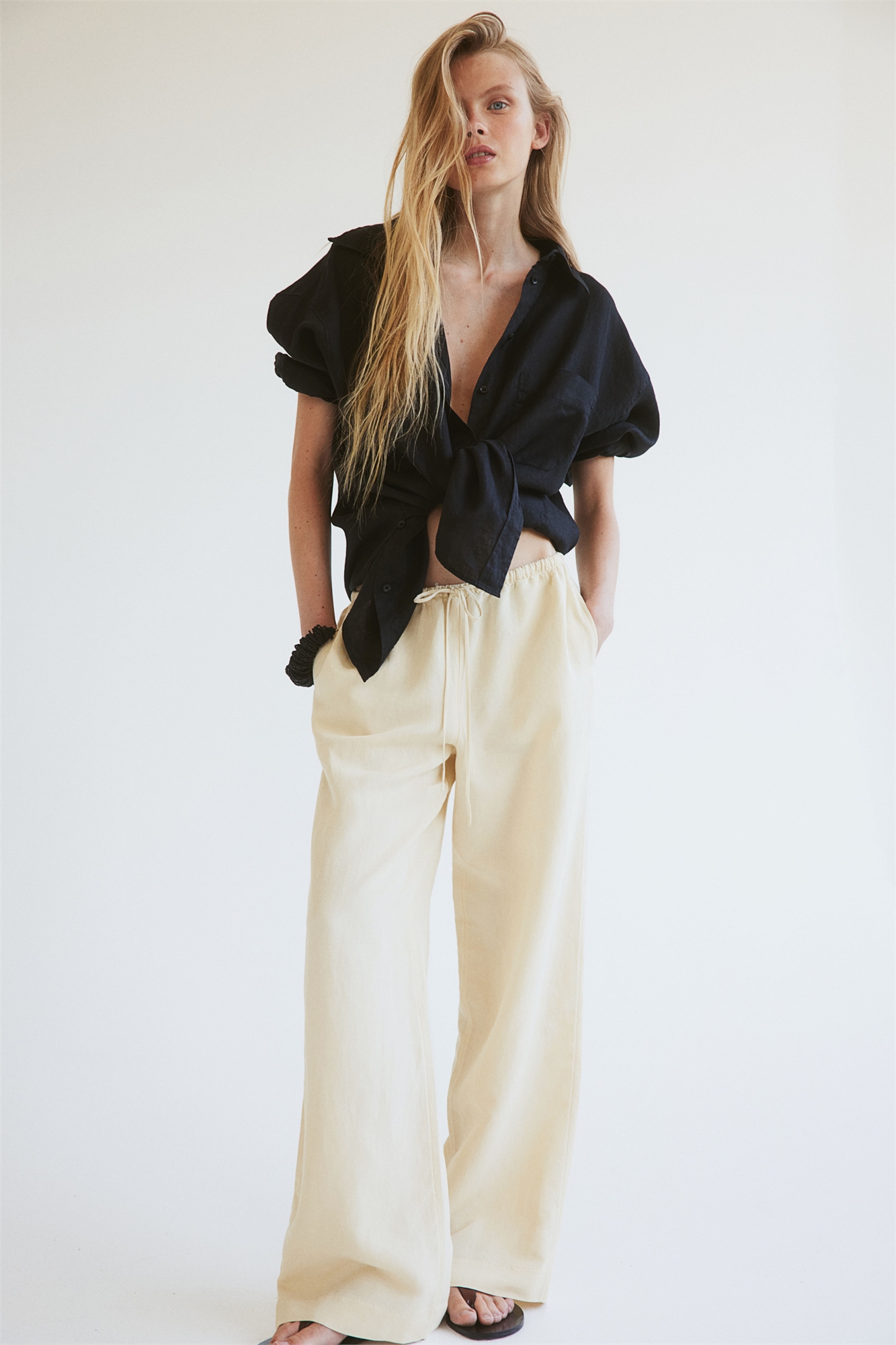 Свободные брюки с воздушным плетением из смеси льна. Регулярная талия с эластичной отделкой и узким шнурком, незаметные боковые карманы, накладные карманы сзади и прямые ноги.