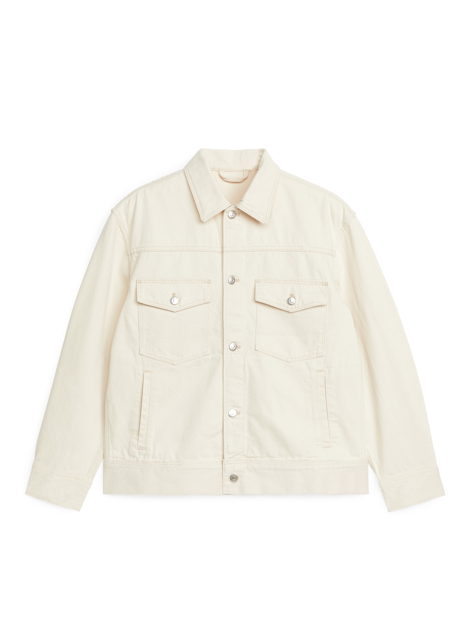 Куртка сшита из неокрашенного хлопкового денима. Модель имеет непринужденный крой, спереди и сзади отделана ярмом. Складной воротник, джинсовые пуговицы-обманки и косые прорезные карманы. Два нагрудных кармана с клапанами на пуговицах. Манжеты на пуговицах.