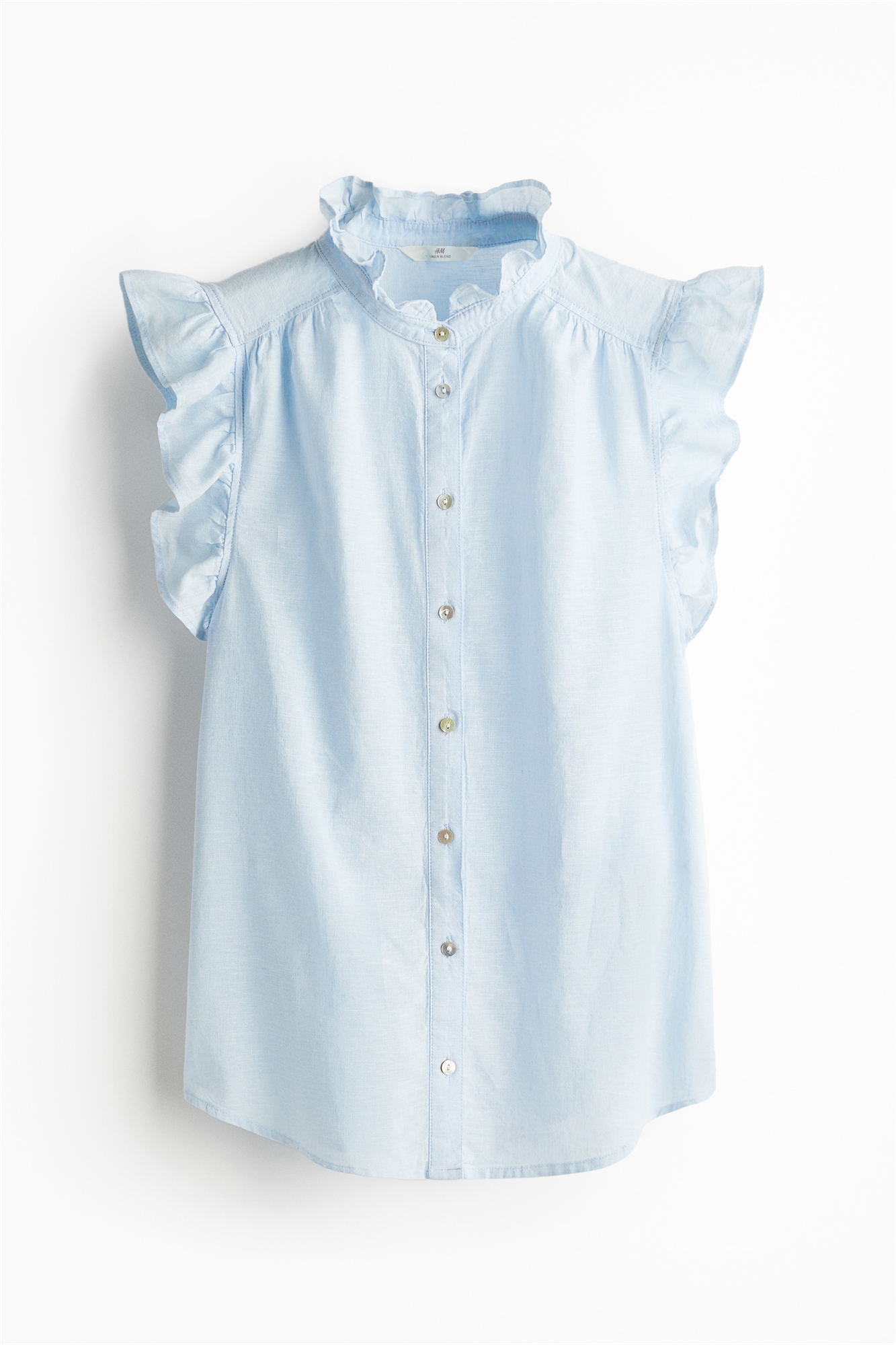 Блузка из воздушного льняного и хлопкового полотна с воротником с оборками и перламутровыми пуговицами спереди. Рукава-воланы и ярмо со сборками на плечах и сзади. Закругленный подол.