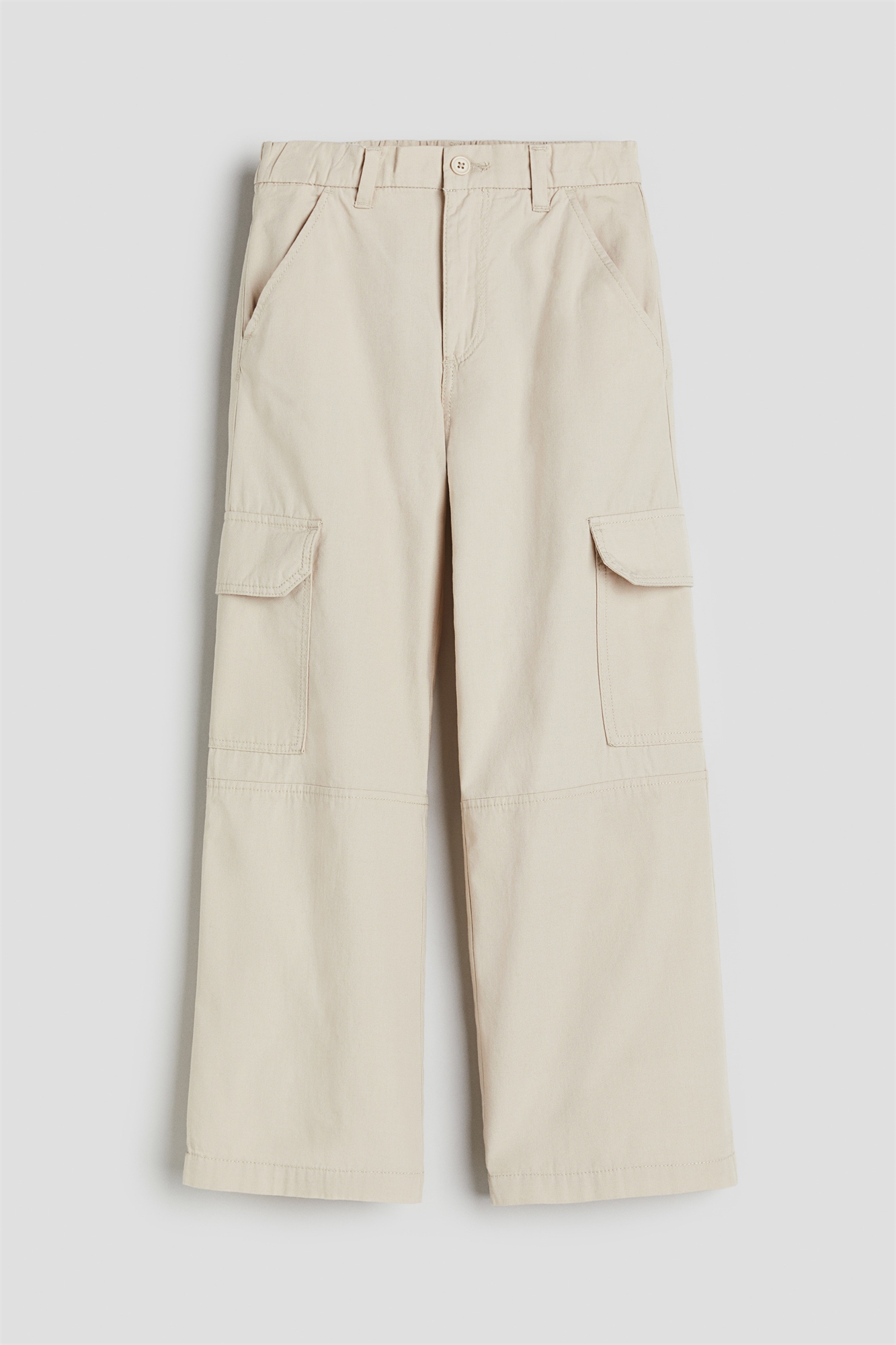 Брюки-карго из хлопкового полотна. Свободный крой, ширинка на молнии и пуговице, мягкий, удобный пояс с закрытой резинкой сзади и скрытой, регулируемой резинкой спереди. Диагональные боковые карманы, фальшивые задние карманы и широкие штанины с откидными карманами.